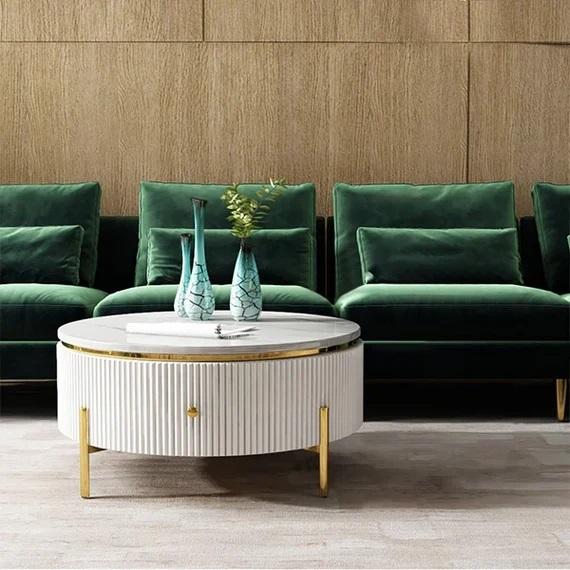 โต๊ะกาแฟคุณภาพพรีเมี่ยมโต๊ะกาแฟหินอ่อนอเนกประสงค์กรอบโลหะกลมตกแต่งโต๊ะกลาง