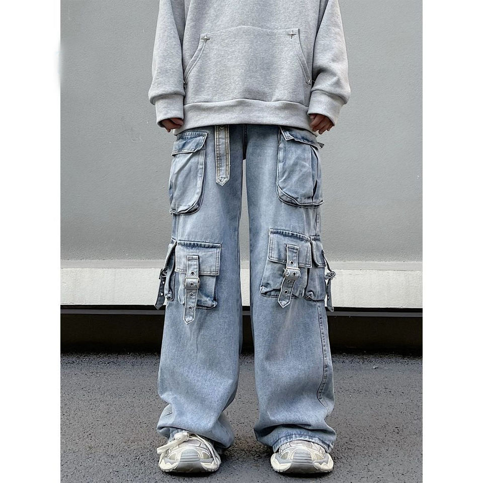 กางเกงคาร์โก้สตรีทแวร์ผู้ชายผ้าฝ้ายคุณภาพพรีเมียม สไตล์ใหม่ ทรงหลวม กระเป๋าเยอะ ลุคยีนส์ฟอกสี