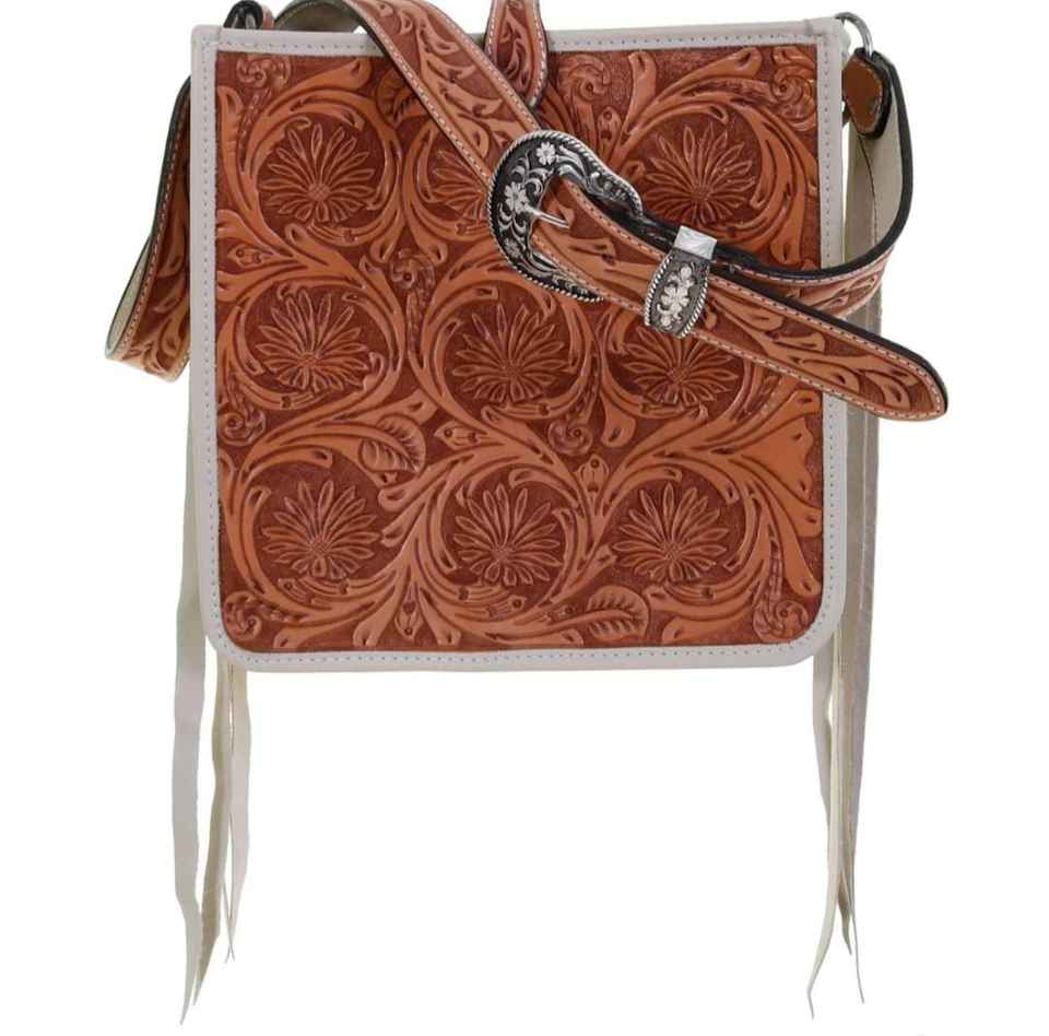กระเป๋าหนังสะพายข้างแบบตะวันตกพร้อมพู่ประดับดอกไม้สไตล์โบฮีเมียนตะวันตก