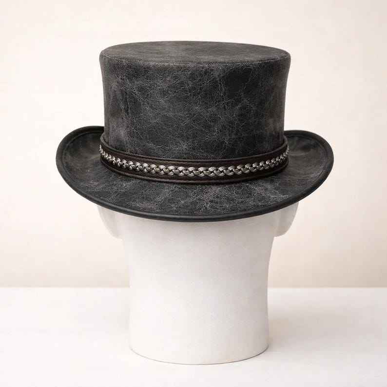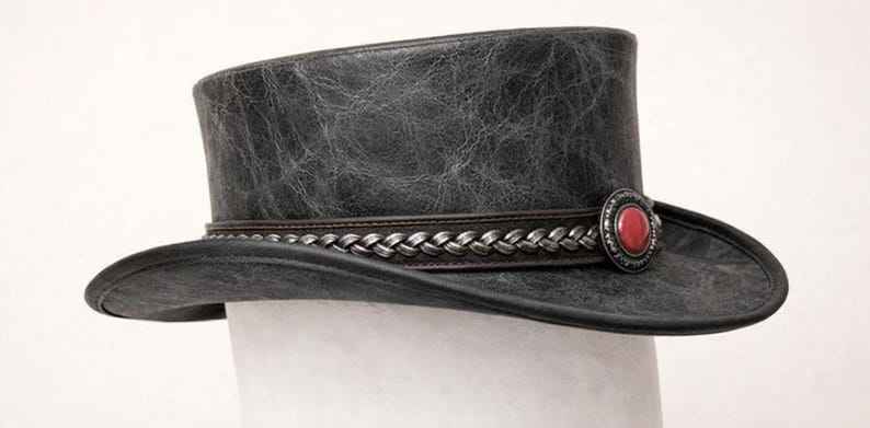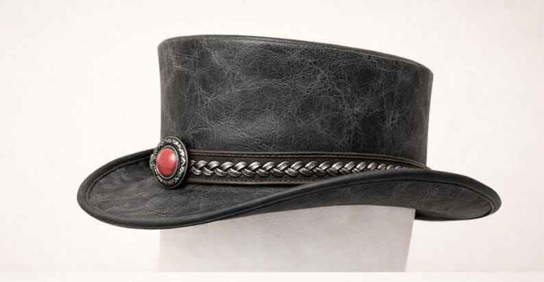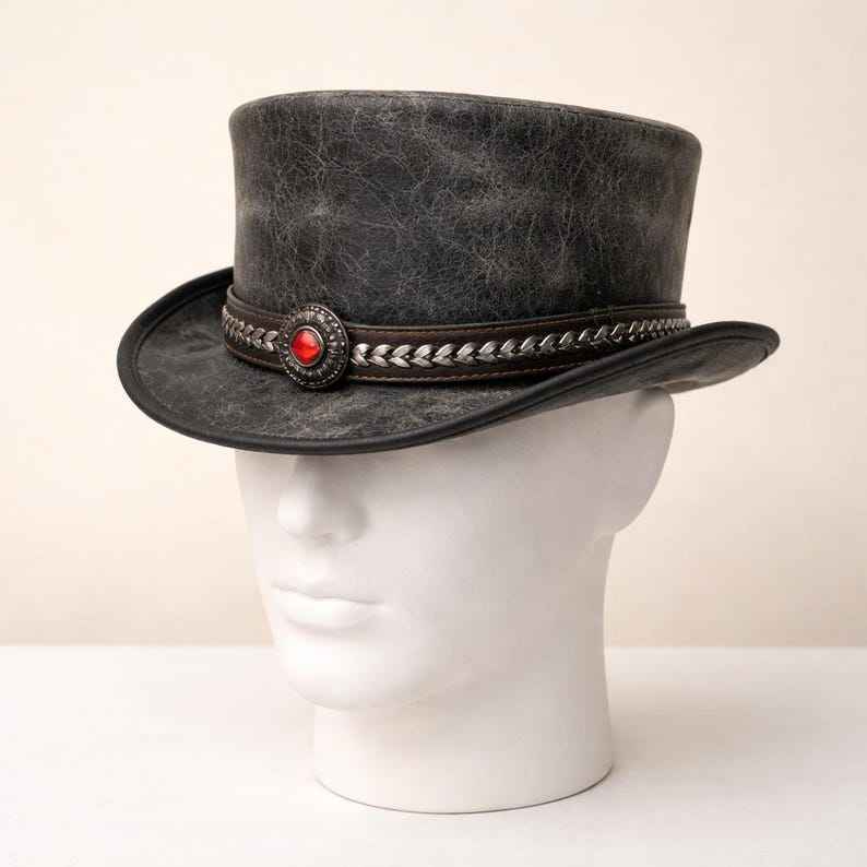 หมวกทรงสูงหนังแท้ทำมือคุณภาพพรีเมียมสำหรับทุกเพศ พร้อมสายโซ่และประดับด้วยหินสีแดง