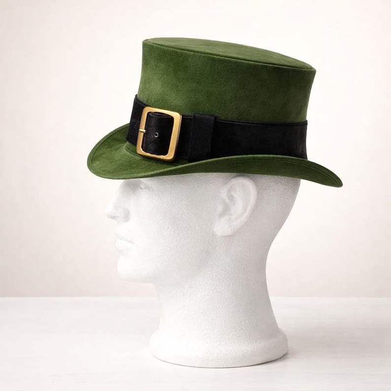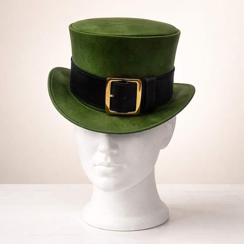 หมวกทรงสูงหนังสีเขียวคุณภาพพรีเมียม ทำมือ งานสั่งทำพิเศษ สำหรับทั้งชายและหญิง พร้อมสายคาดหัวแบบหัวเข็มขัด ของขวัญสำหรับชุดแต่งกายวันเซนต์แพทริก