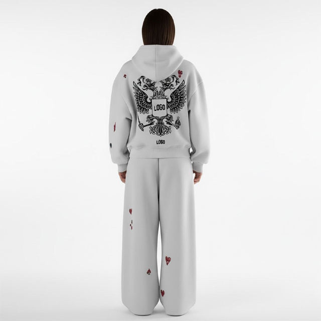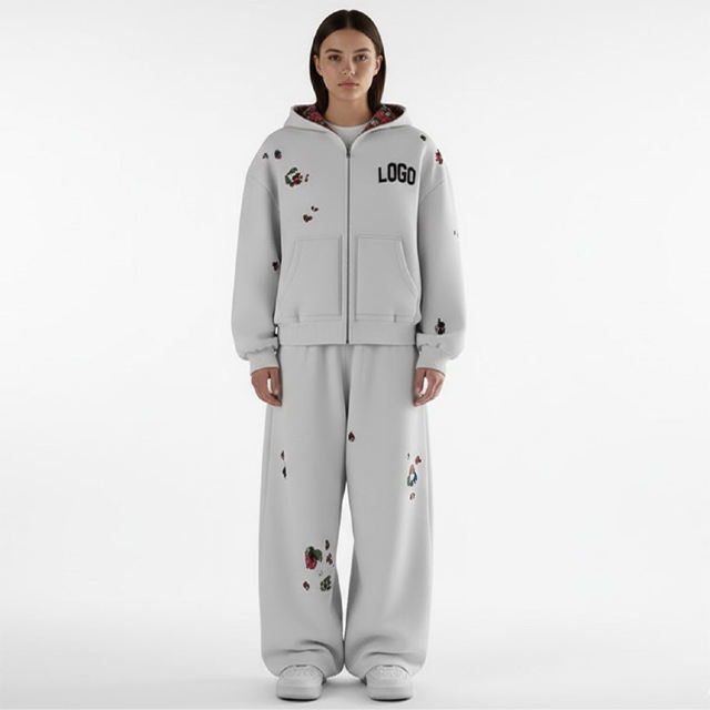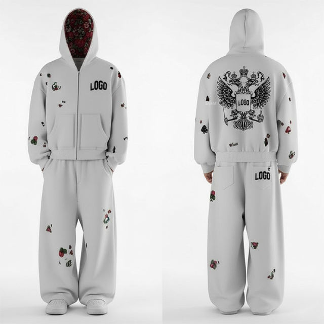ชุดวอร์มผ้าคอตตอน 100% คุณภาพพรีเมียม พิมพ์ลายกรด ลวดลายโลโก้แบบกำหนดเอง ประดับคริสตัล น้ำหนักมาก สไตล์สตรีทแวร์สำหรับฤดูหนาว เหมาะสำหรับทุกเพศ