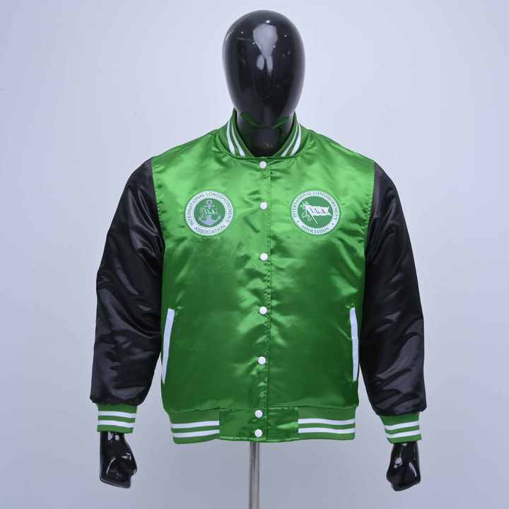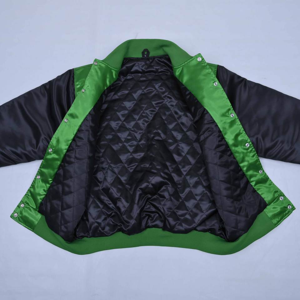 ผู้ผลิตเสื้อแจ็คเก็ตแบบกำหนดเองคุณภาพพรีเมียม ปักโลโก้ด้านหน้าและด้านหลัง เสื้อแจ็คเก็ตซาตินแบบวาร์ซิตี้ เสื้อแจ็คเก็ตเบสบอลซาติน เสื้อแจ็คเก็ตบอมเบอร์