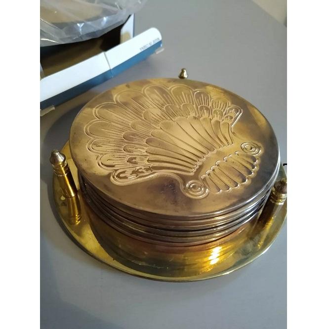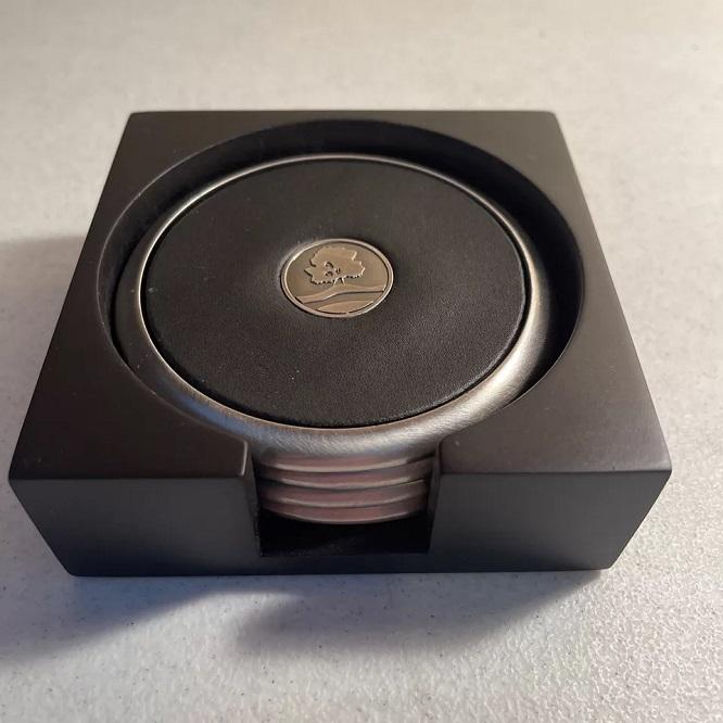 ชุดถาดรองแก้วโลหะสีเงินทำจากหนังแท้รูปทรงกลมเรียบง่ายโลโก้ออกแบบได้ตามต้องการ
