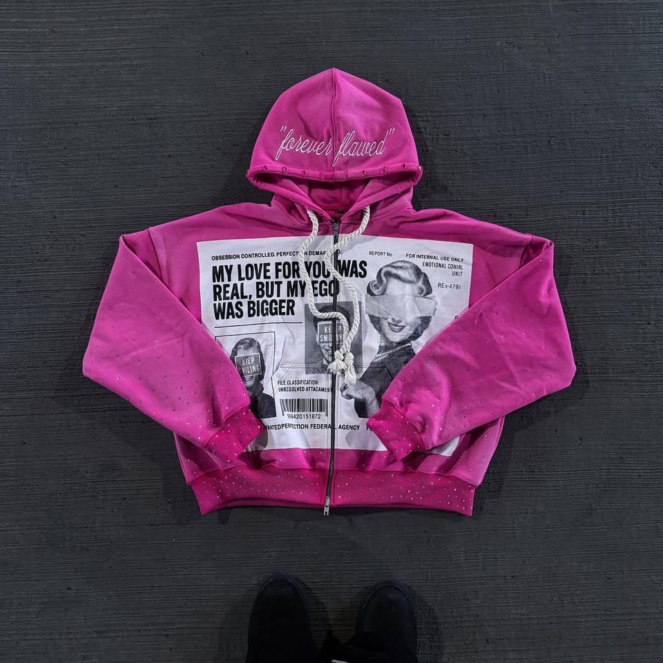 เสื้อวอร์มสไตล์สตรีทที่กำหนดได้เองมีฮู้ดเย็บปักด้วยพลอยเทียมทรงหลวมระบายอากาศมีเชือกผูก
