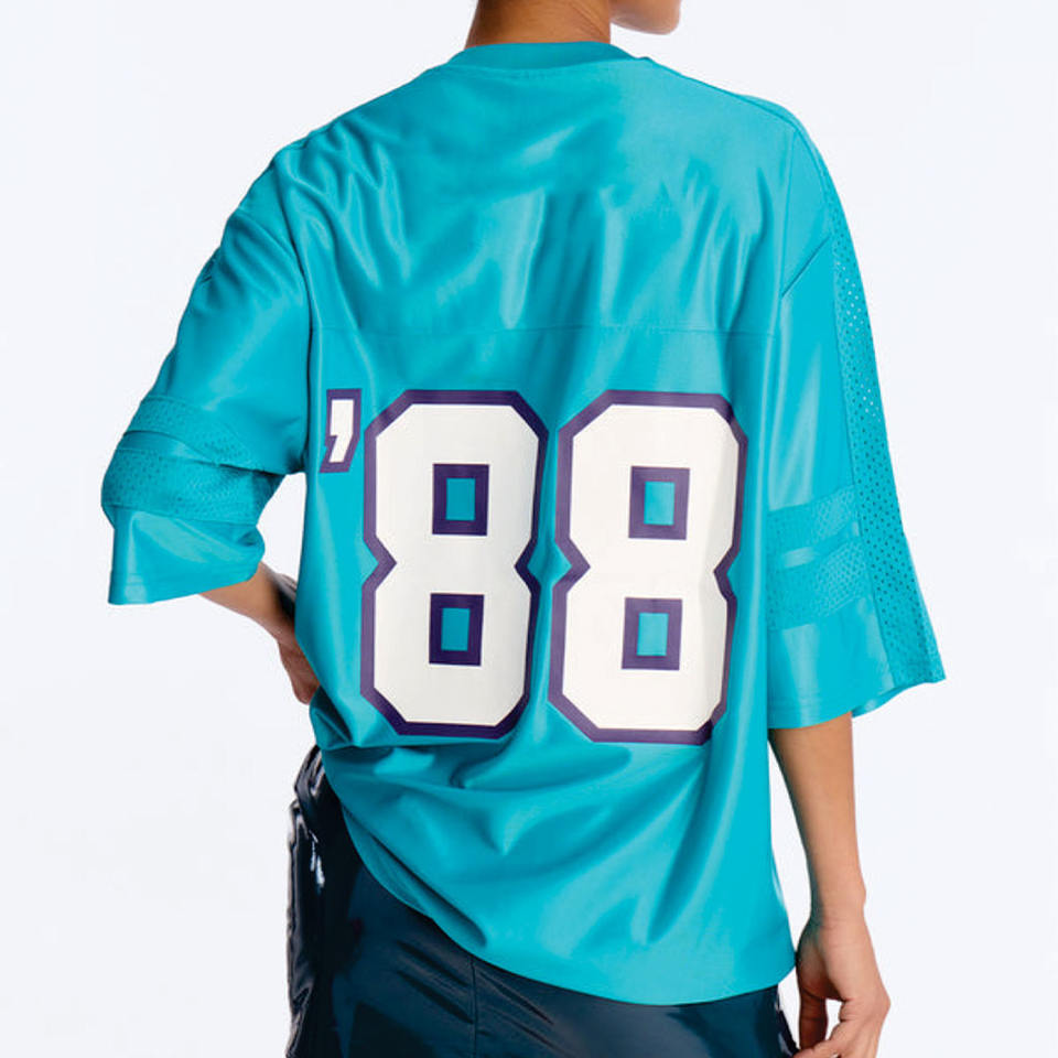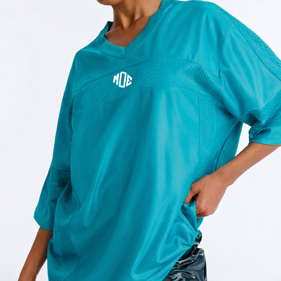 เสื้อเจอร์ซีย์อเมริกันคุณภาพพรีเมียมสั่งทำพิเศษสำหรับผู้หญิง สีน้ำเงิน ทรงโอเวอร์ไซส์ ผ้าตาข่าย คอวี ระบายอากาศได้ดี ผลิตจากโพลีเอสเตอร์ ทรงหลวม จำหน่ายส่งจำนวนมาก