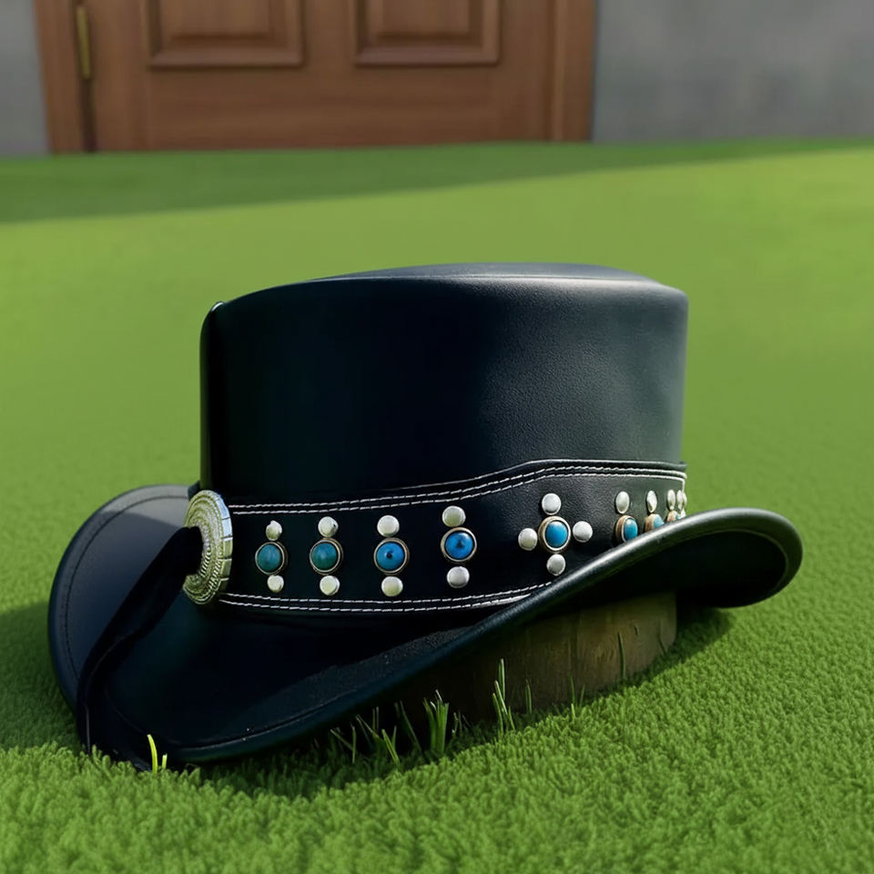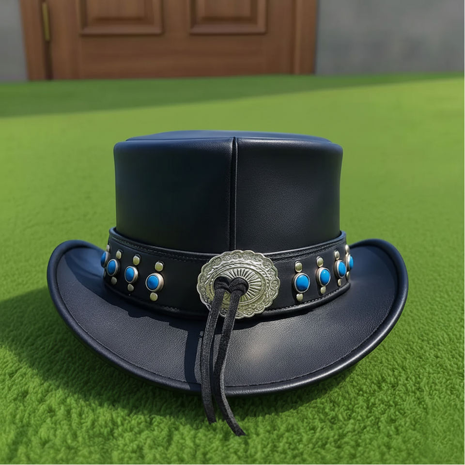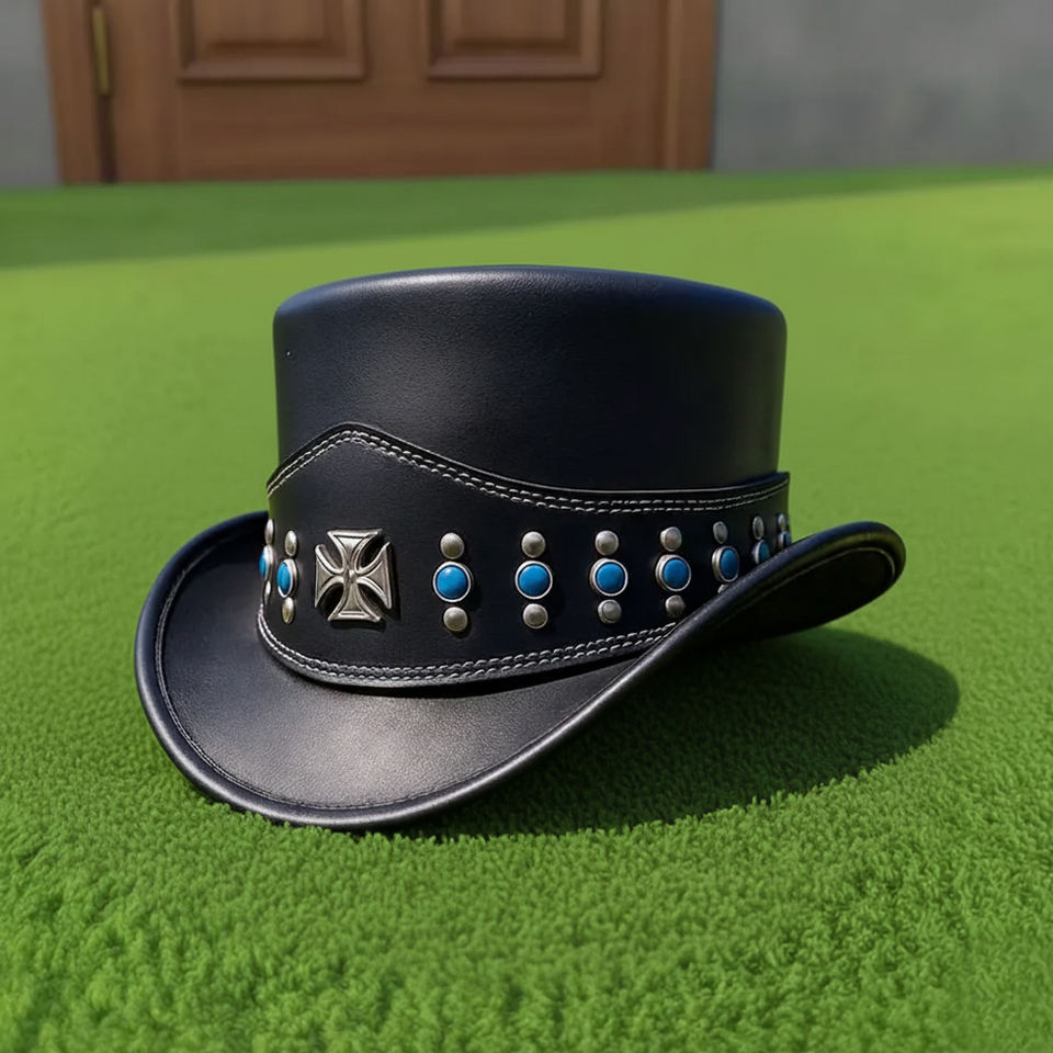 หมวกทรงสูงสไตล์สตีมพังก์หนังสีดำประดับหมุด งานแฮนด์เมดสั่งทำพิเศษ คุณภาพพรีเมียม สำหรับคอสเพลย์ เทศกาล และแฟชั่นธีมต่างๆ