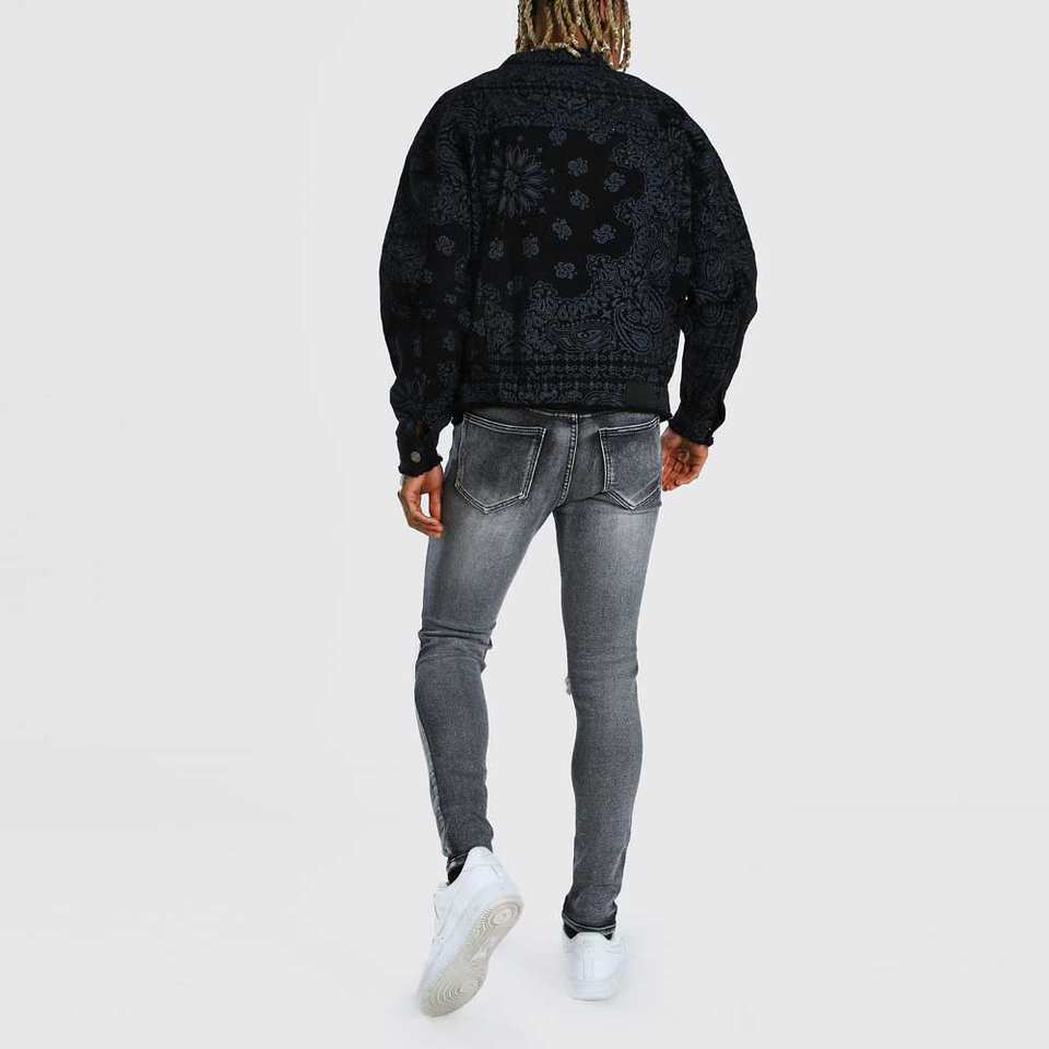 Premium Quality Distressed Hip Hop Men's Denim Jacket Stand Collar Front Ripped Embroidery Patches Fully Customized