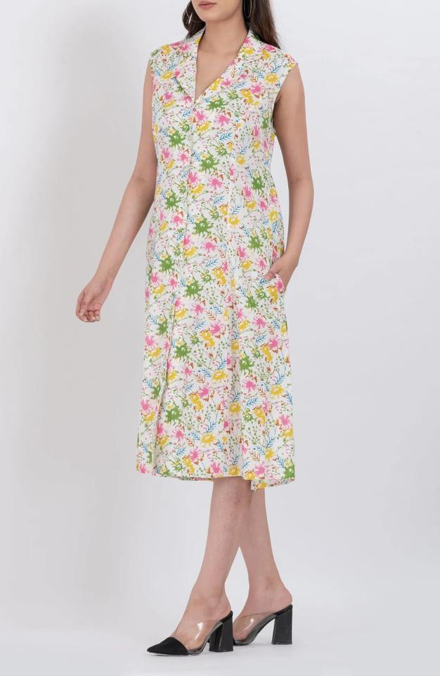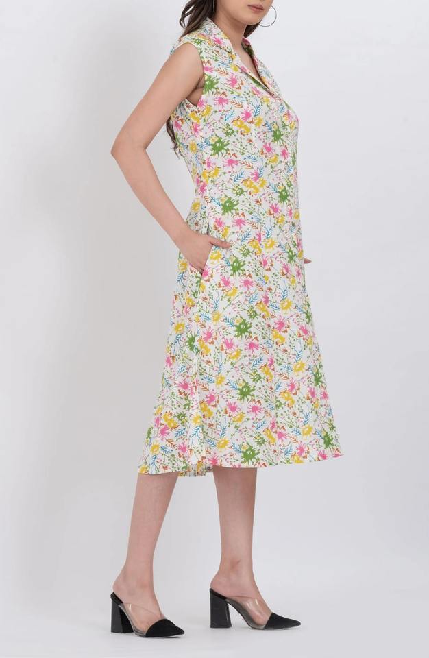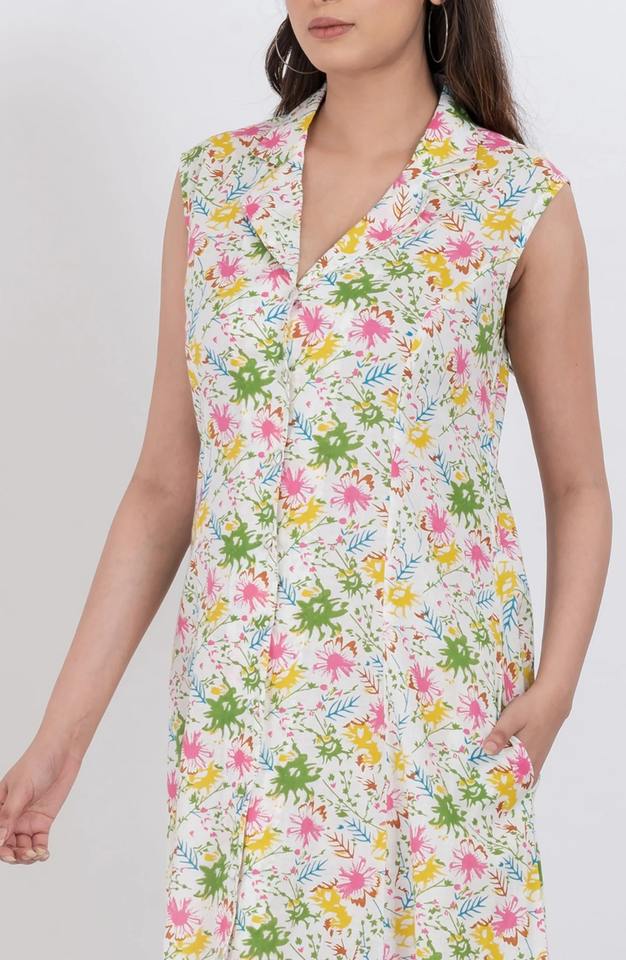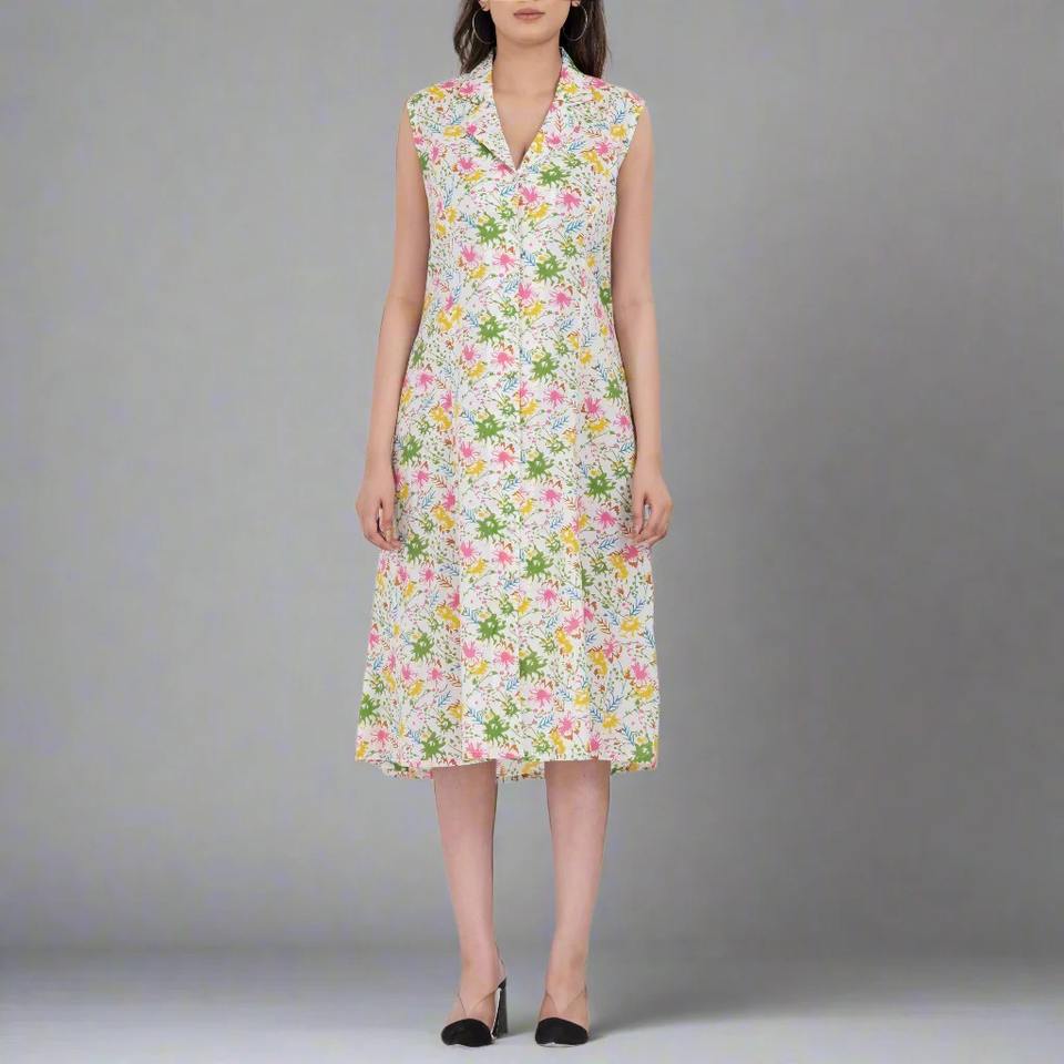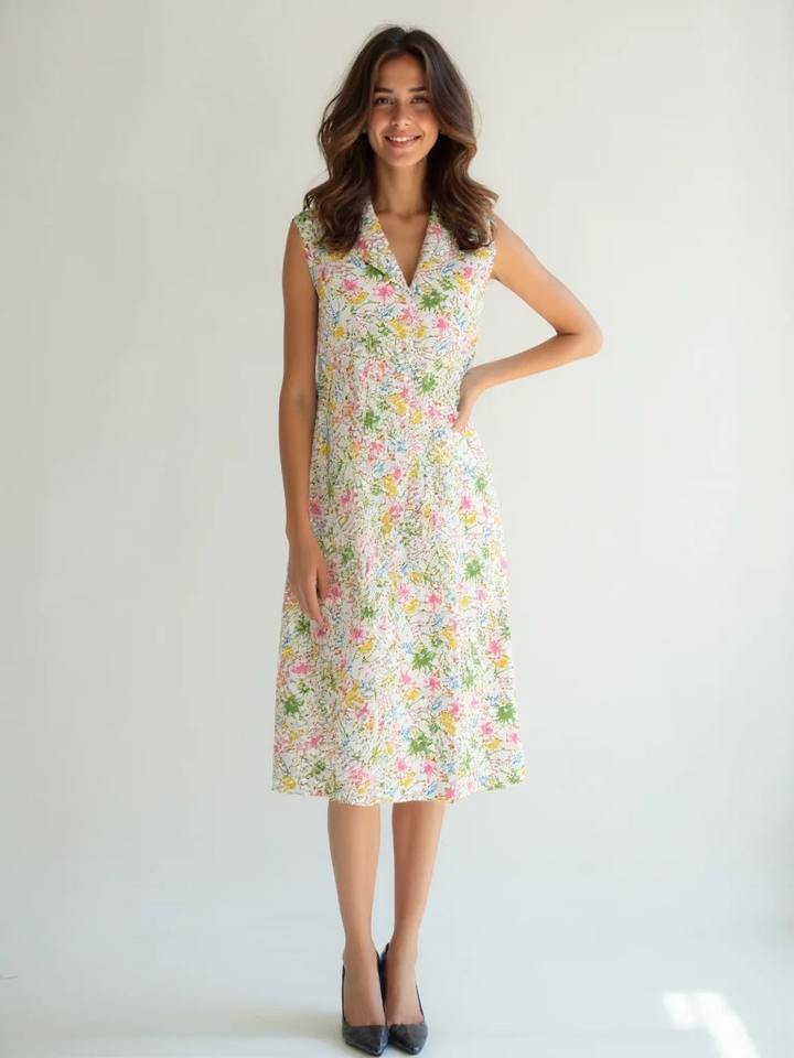 เดรสสั้นผ้าฝ้ายลายดอกคุณภาพพรีเมียม เป็นมิตรกับสิ่งแวดล้อม ซักได้ คอวี แขนกุด จับจีบ น้ำหนักเบา สวมใส่สบาย เหมาะสำหรับฤดูร้อน