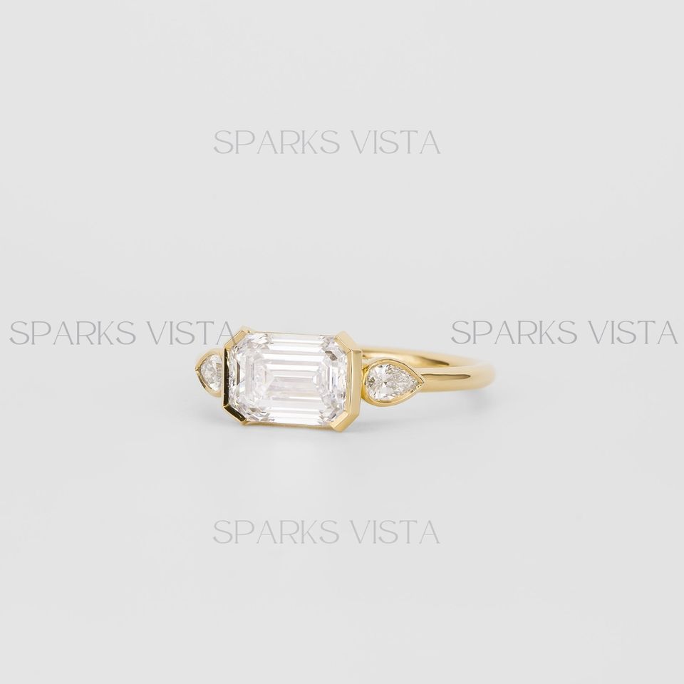 แหวนหมั้นเพชรที่เจียระไนจากมรกตคุณภาพระดับพรีเมี่ยม | ดีไซน์หินสามชิ้นพร้อมเพชรด้านข้างรูปลูกแพร์925เงินสเตอร์ลิง