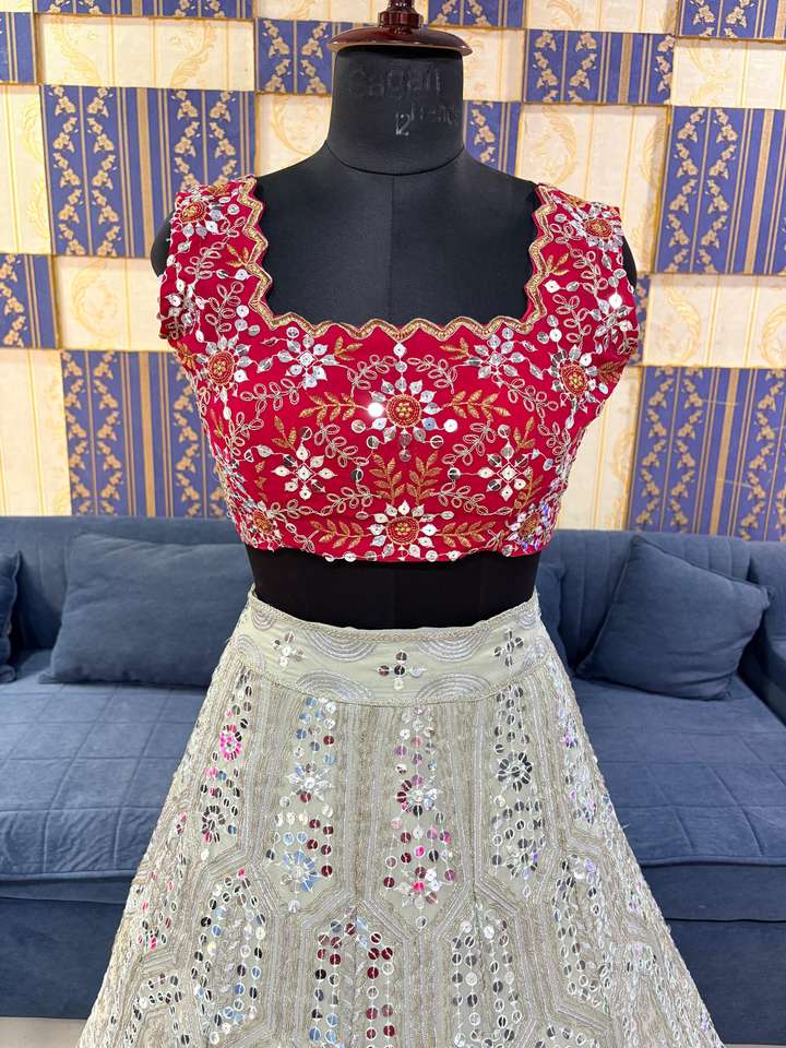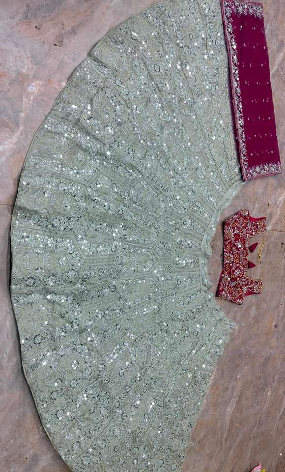 ชุดเลเฮนกาโชลีผ้าจอร์เจตต์คุณภาพพรีเมียมสำหรับฤดูร้อน ความยาวระดับพื้น ดีไซน์ทันสมัยสไตล์อินเดีย-ปากีสถาน ปักลายประดับเลื่อมและงานตัดเย็บแบบคันแคน
