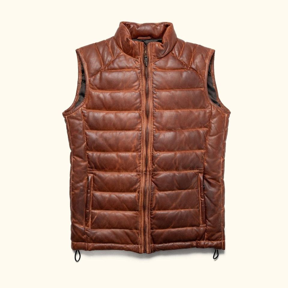 เสื้อกั๊กหนังแท้คุณภาพพรีเมียม เสื้อกั๊กอุ่นสำหรับฤดูหนาว เสื้อกั๊กพัฟเฟอร์แบบไม่มีแขน เสื้อกั๊กพัฟเฟอร์ลำลองสำหรับผู้ชาย CP-MLV-09