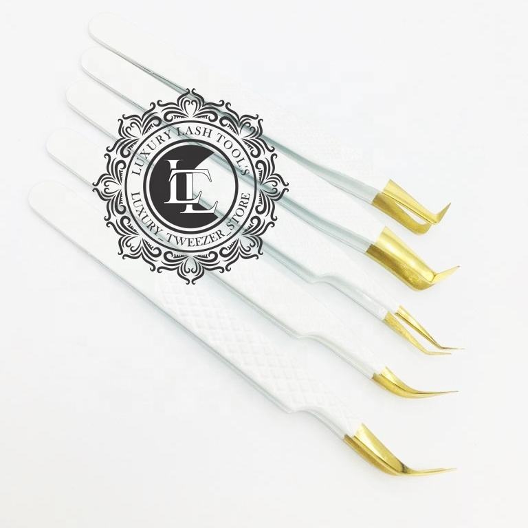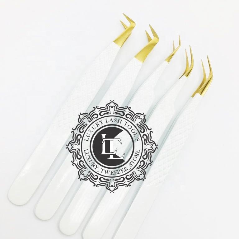 คีมหนีบขนตาสแตนเลสสีขาวแบบเพชรคุณภาพระดับพรีเมียมแหนบปลายทองเคลือบด้วยผงทดสอบด้วยมือฉลากส่วนตัว