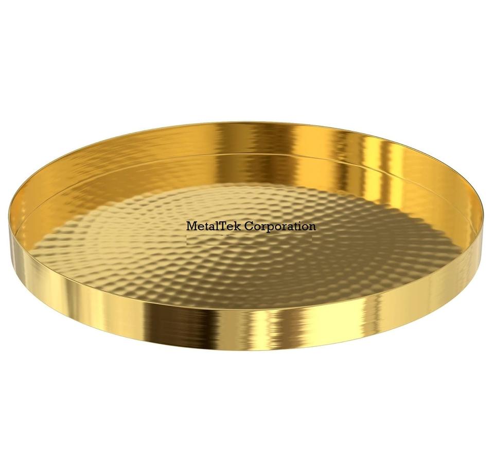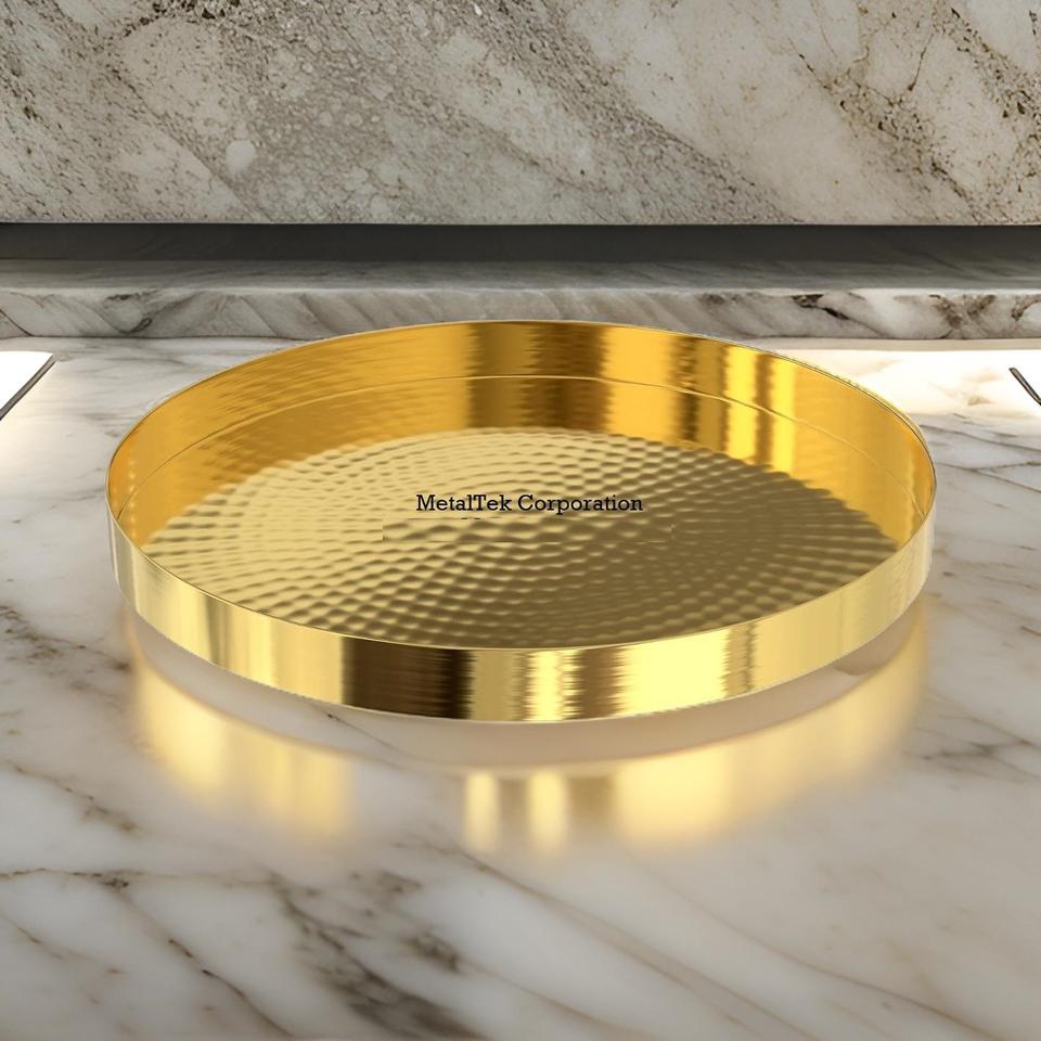 ถาดโลหะตกแต่งทรงกลมเคลือบทองคุณภาพพรีเมียม ลายตอกแบบมีเท็กซ์เจอร์ สำหรับเสิร์ฟ จัดเก็บเครื่องประดับ และเครื่องสำอาง