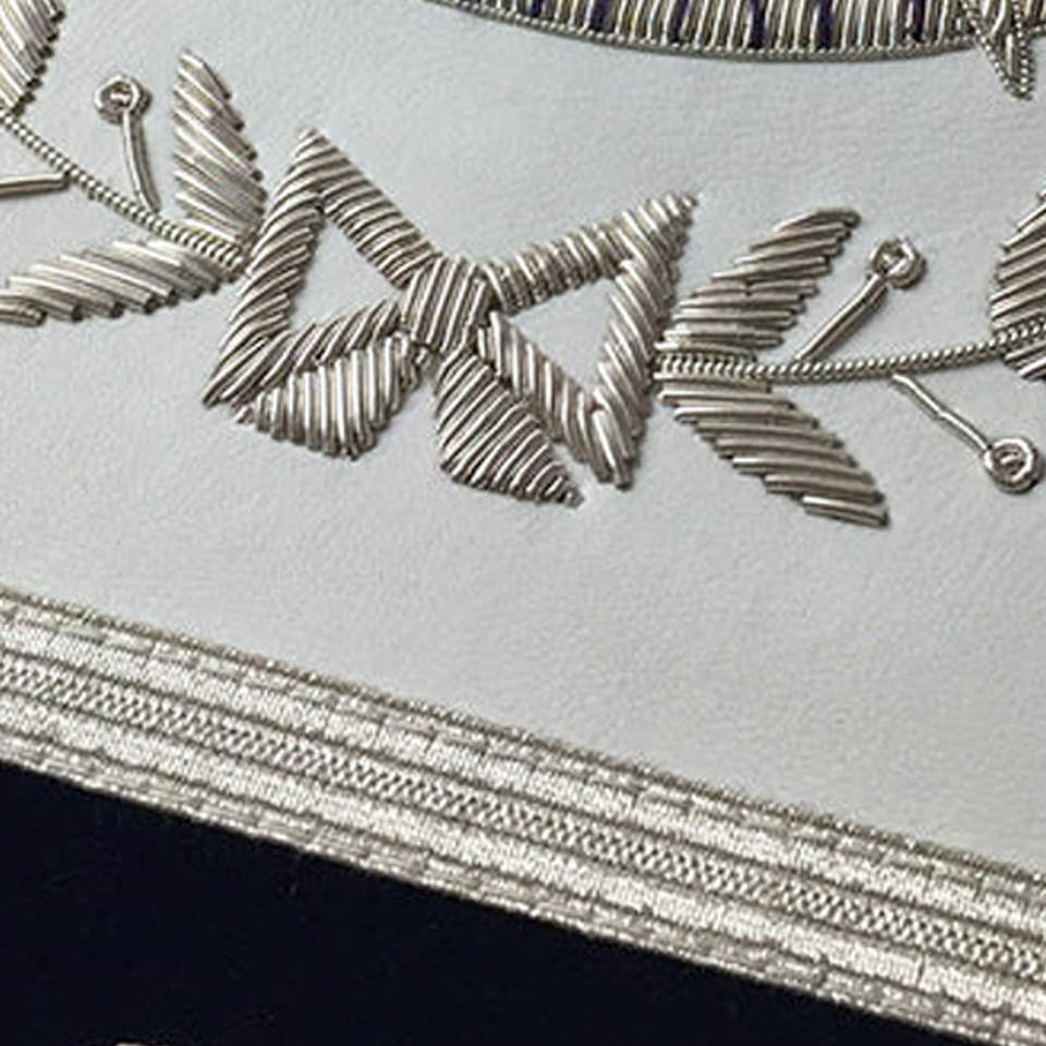 ผ้ากันเปื้อนเครื่องราชกกุธภัณฑ์แบบปักด้วยมือคุณภาพระดับพรีเมี่ยมผ้ากันเปื้อนลายอิฐสีน้ำเงินเข้มผ้ากำมะหยี่สีขาวและสีกรมท่า