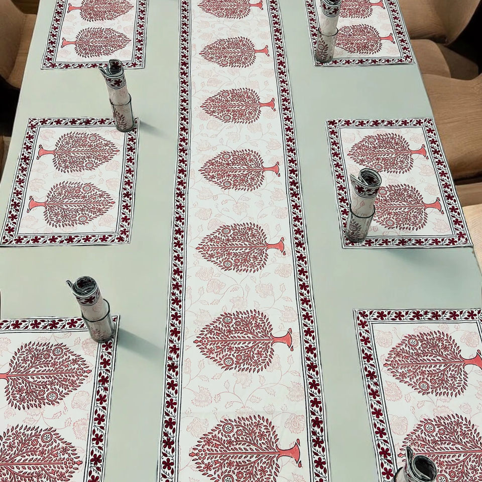 Premium Quality Handcrafted Cotton Dining Table Runner Elegant Red White Tree Life Block Print Design Knitted Napkins Placemats