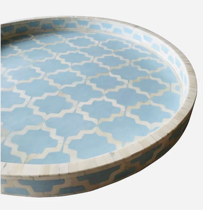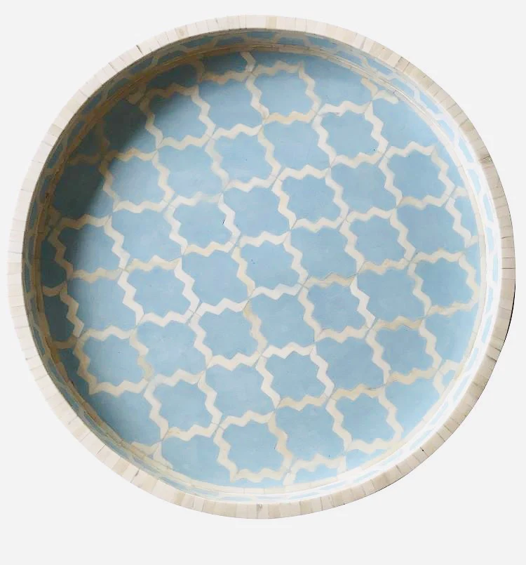 ถาดเสิร์ฟทรงกลมงานฝีมือคุณภาพพรีเมียม ประดับไม้และกระดูก สำหรับใช้ในครัว บ้าน โรงแรม เหมาะสำหรับเทศกาลรอมฎอน คุณภาพดีที่สุดจากอินเดีย