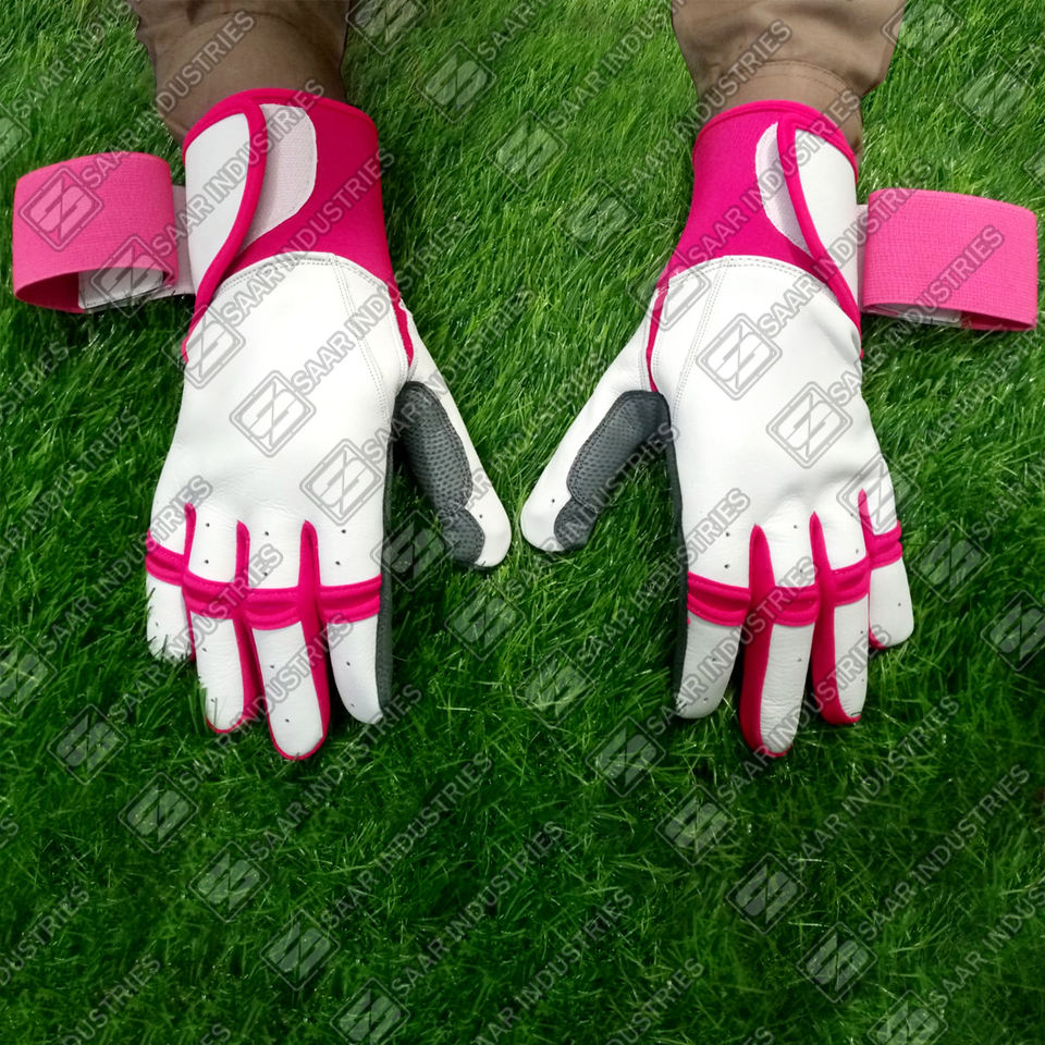 Premium Quality Heavy Duty Sports Training Long Cuff White Pink & Grey Color Combination Baseball Softball Batting Gloves