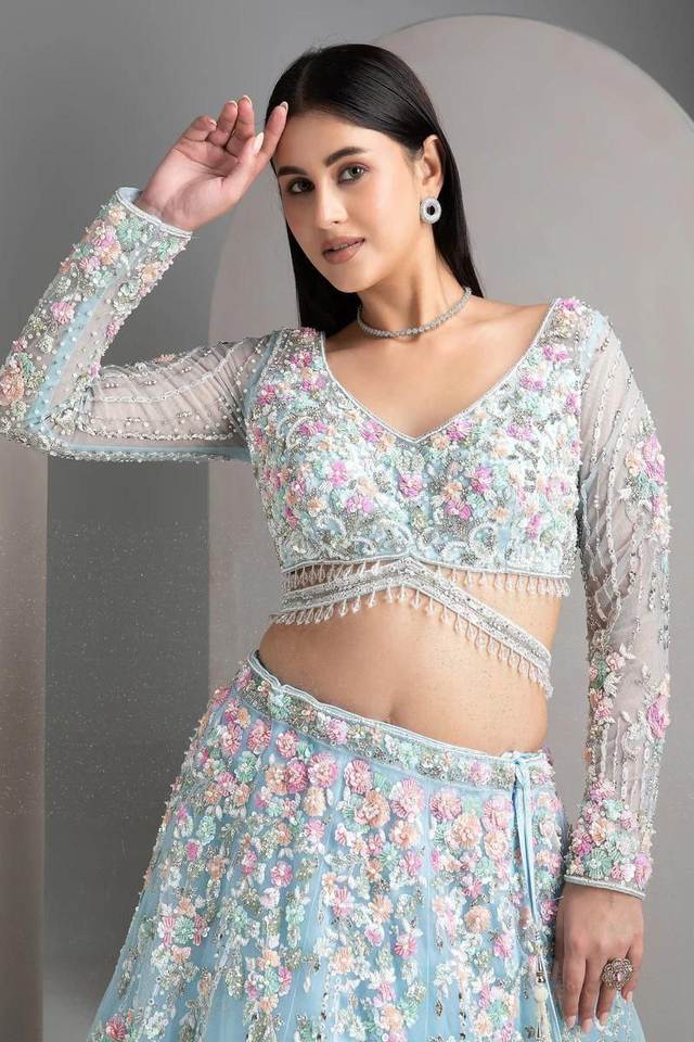 ชุดเลเฮนกาผ้าแคนแคนพร้อมผ้าคลุมไหล่ผ้าออร์แกนซ่าเนื้อหนาคุณภาพพรีเมียม ปักเลื่อมงานปาร์ตี้ ผ้าพัตตา 4 เมตร ทรงบาน แห้งเร็ว