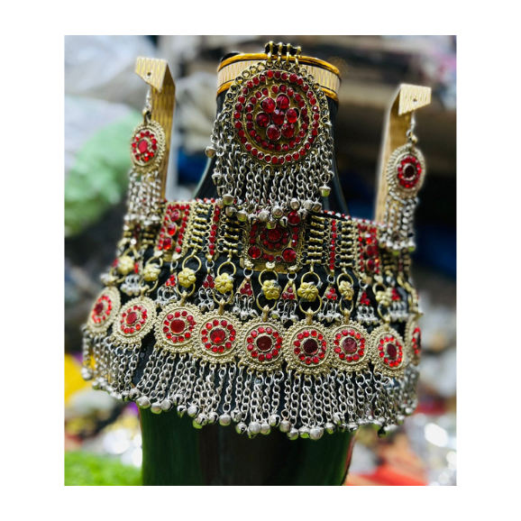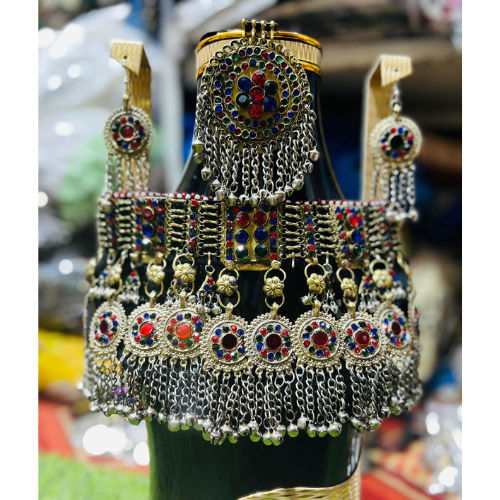 ชุดเครื่องประดับเจ้าสาวสไตล์ปากีสถานแบบอัฟกานิสถานชุดเครื่องประดับออกซิไดซ์โบราณสำหรับผู้หญิงทำด้วยมือ