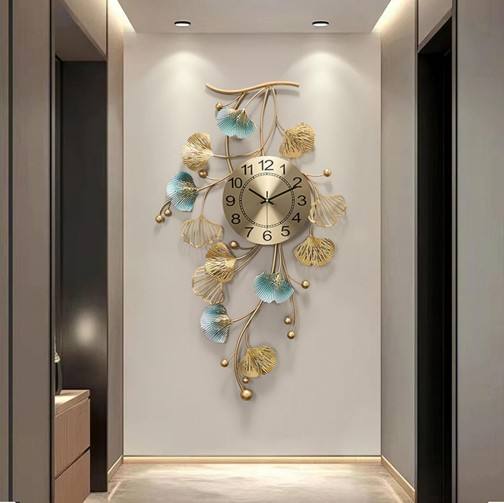 นาฬิกาแขวนผนังใบไม้คุณภาพพรีเมียม สินค้าตกแต่งผนังแบบใหม่สำหรับห้องนั่งเล่น ห้องรับประทานอาหาร ฉากหลังขนาดใหญ่ นาฬิกาแขวนผนังโลหะ