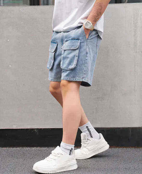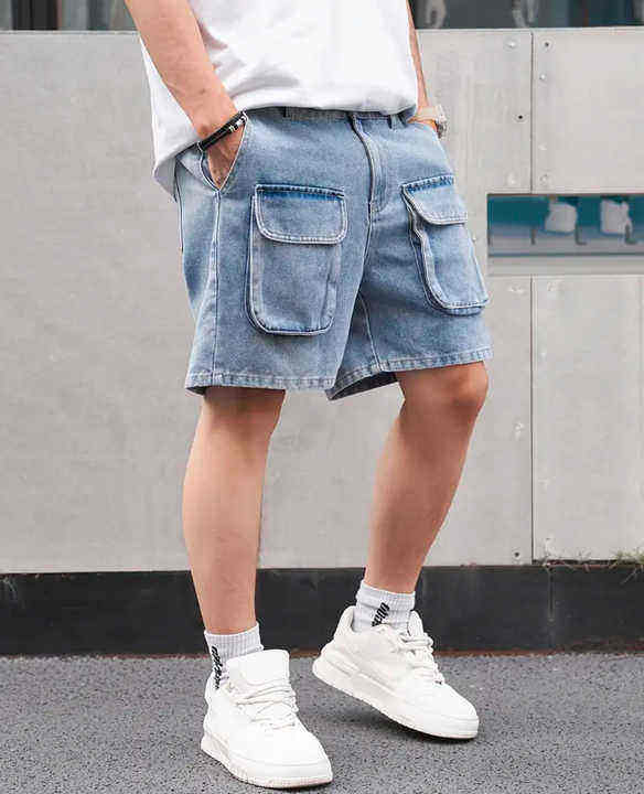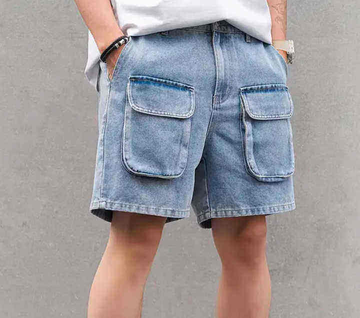 กางเกงยีนส์ขาสั้นผ้าฝ้าย100% ลำลองของผู้ชายกางเกงขาสั้นผ้าฝ้ายมีหลายกระเป๋าทรงหลวม