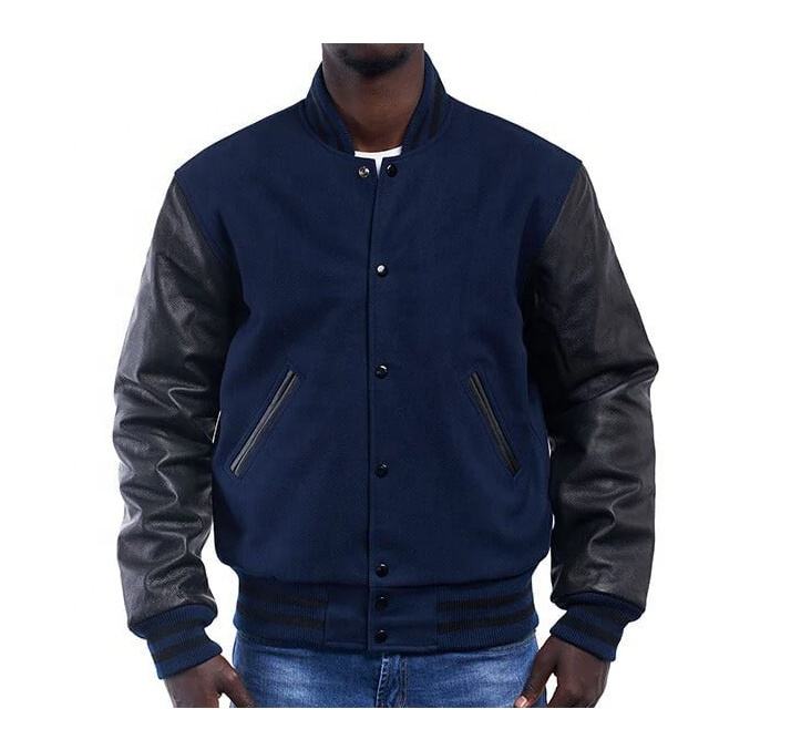 แจ็คเก็ตวาร์ซิตี้ขนสัตว์คุณภาพพรีเมียมสำหรับผู้ชาย แขนหนัง ปรับขนาดได้ โลโก้ด้านหน้า แจ็คเก็ตวาร์ซิตี้สำหรับฤดูหนาว