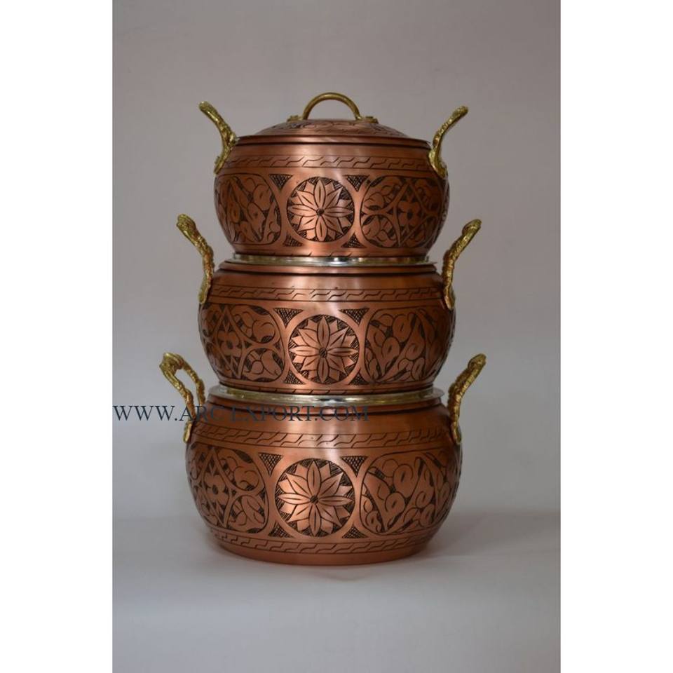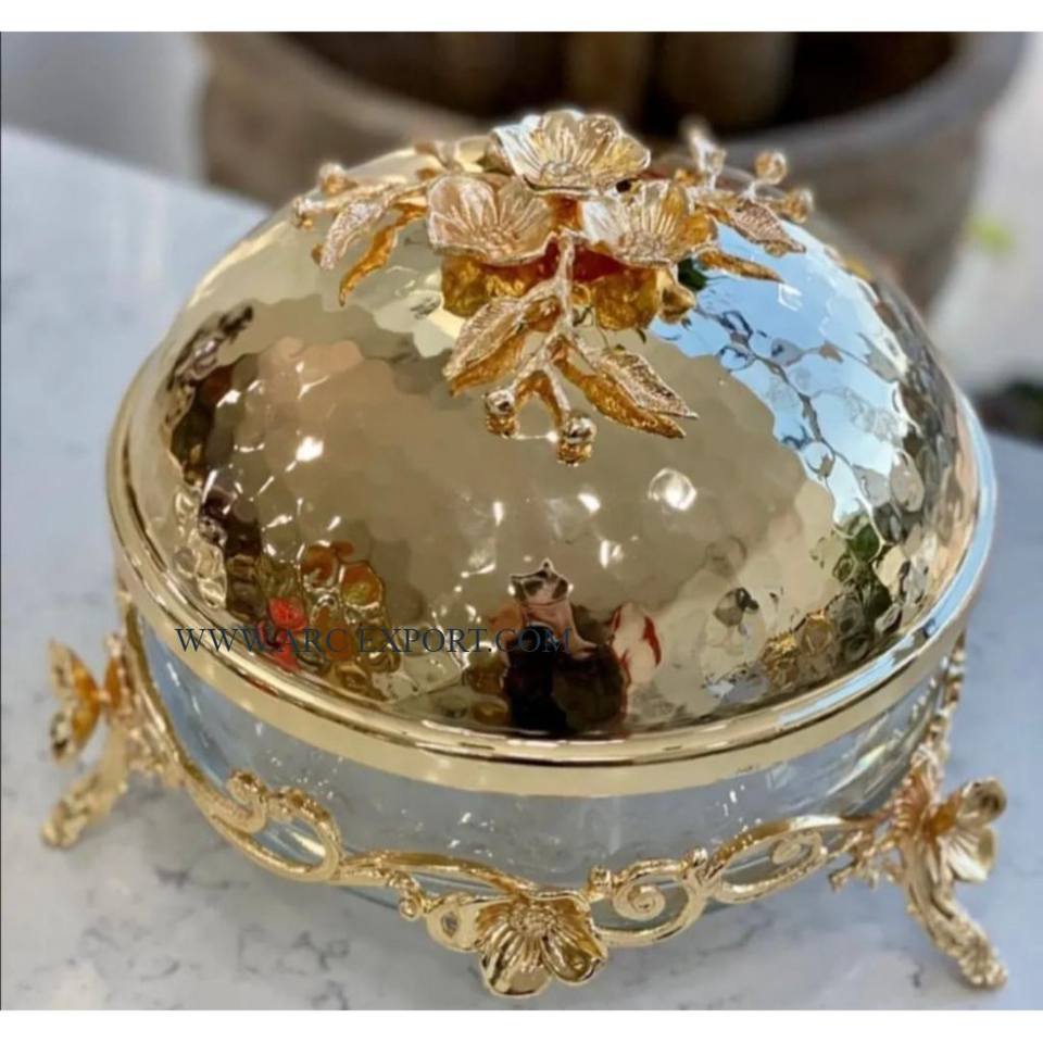 Premium Quality Metal Round Food Serving Pots Marvelous Designing Large Size Metal and Glass Hammered Table Top Serving Dish