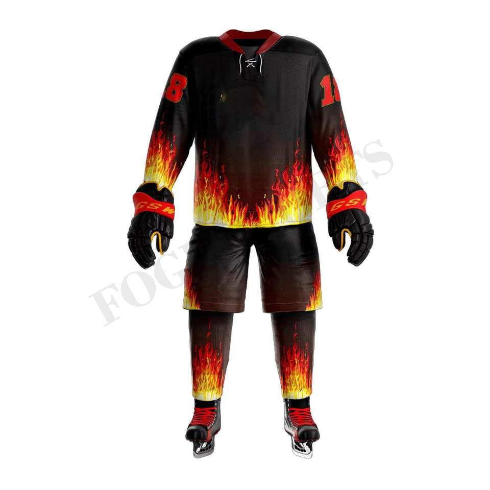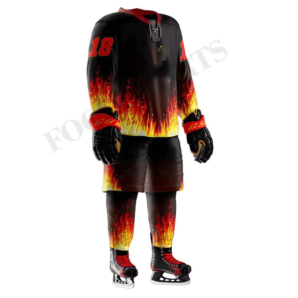 ชุดยูนิฟอร์มฮอกกี้น้ำแข็งคุณภาพพรีเมียม OEM ผลิตจากโพลีเอสเตอร์ 100% พร้อมสีและโลโก้ที่ปรับแต่งได้ ผลิตจากโรงงาน ราคาขายส่ง