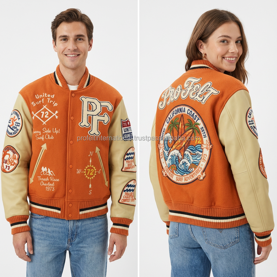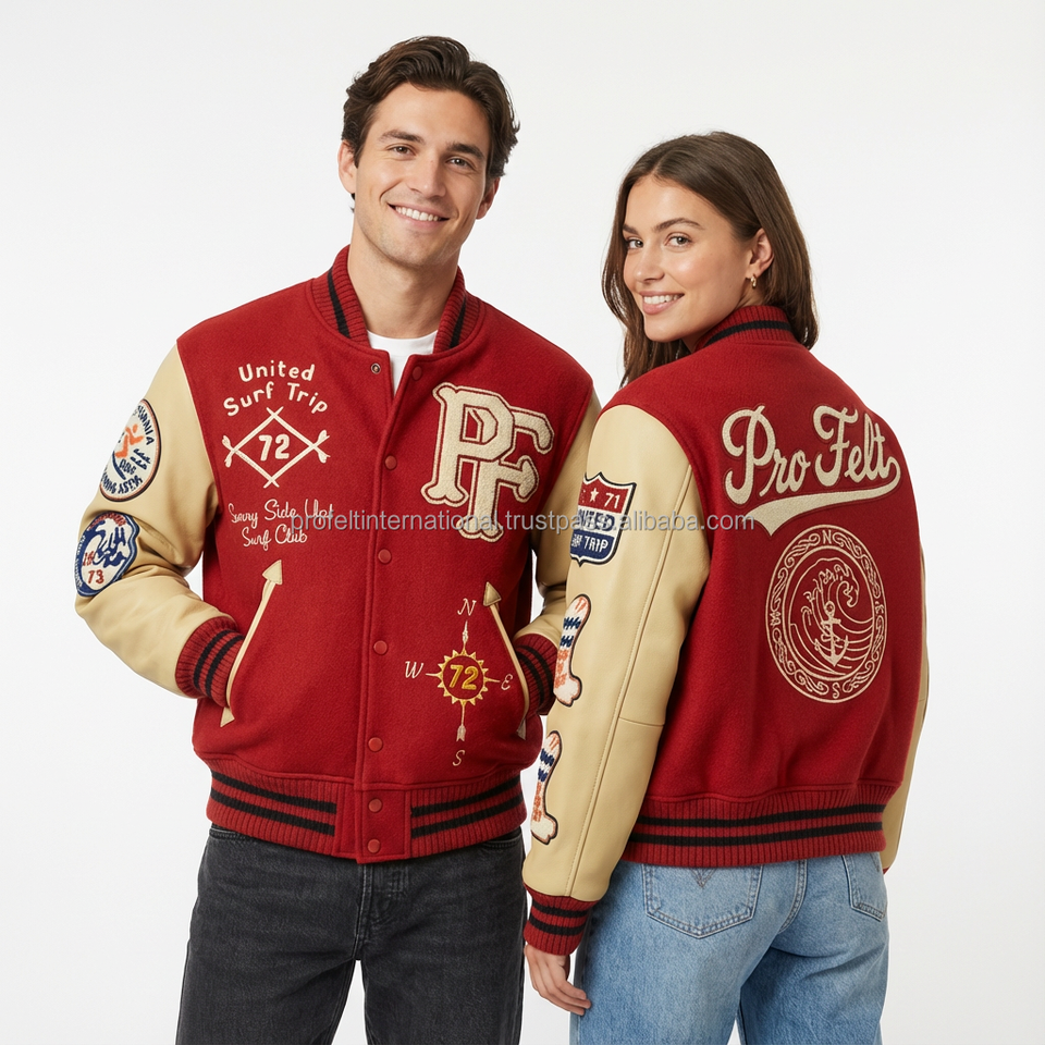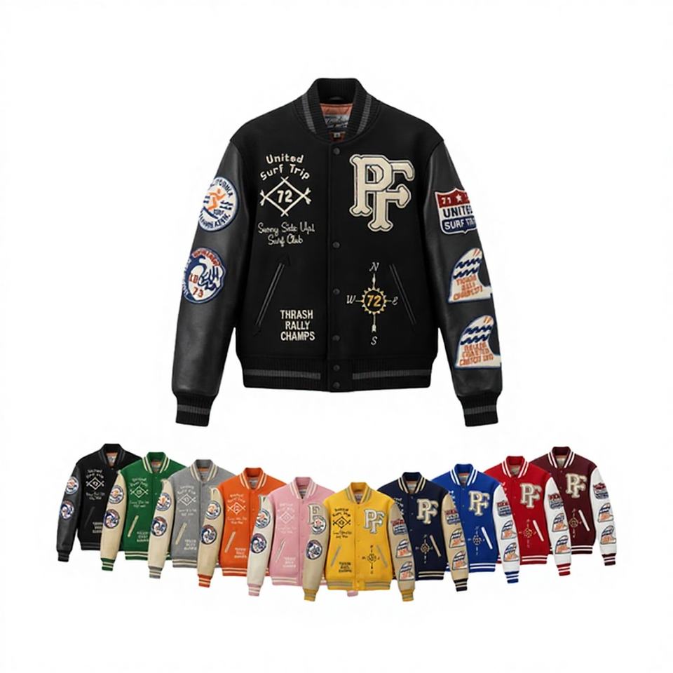 แจ็คเก็ตเบสบอลคุณภาพพรีเมียม OEM ขายส่ง แจ็คเก็ตวาร์ซิตี้ ตัวเสื้อทำจากผ้าขนสัตว์ แขนเสื้อทำจากโพลีเอสเตอร์ ตกแต่งด้วยแพทช์ต่างๆ แบบต่อผ้า ลายตัวอักษรแบบ Letterman