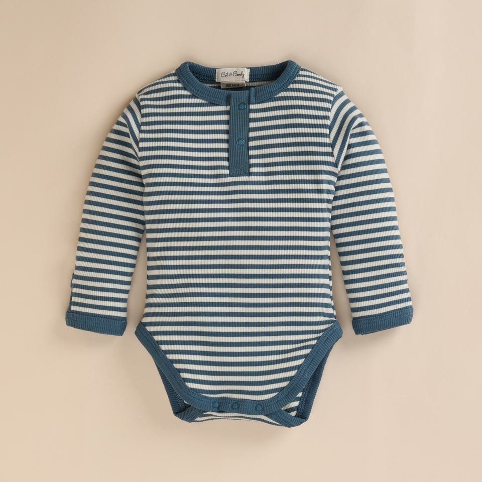 ชุดบอดี้สูทแขนยาวทำจากไม้ไผ่อีลาสเทนออร์แกนิกสำหรับเด็กเสื้อผ้าเด็กลายทางสีน้ำเงิน