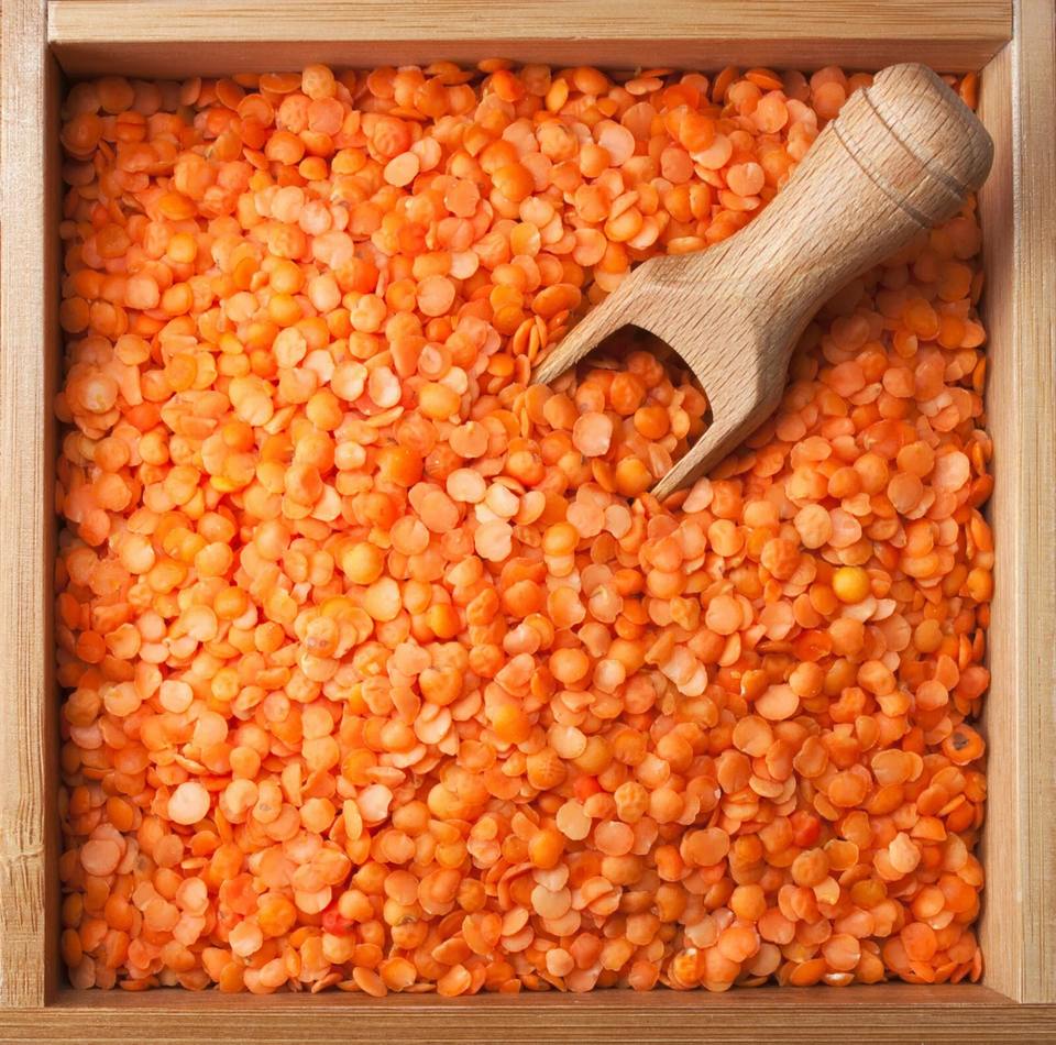 ถั่วเลนทิลสีแดงออแกนิกเมล็ดและเกล็ดแห้งตามธรรมเนียมสำหรับการเพาะปลูกแบบออร์แกนิกที่ผ่านการรับรองอาหาร