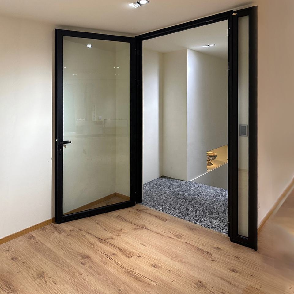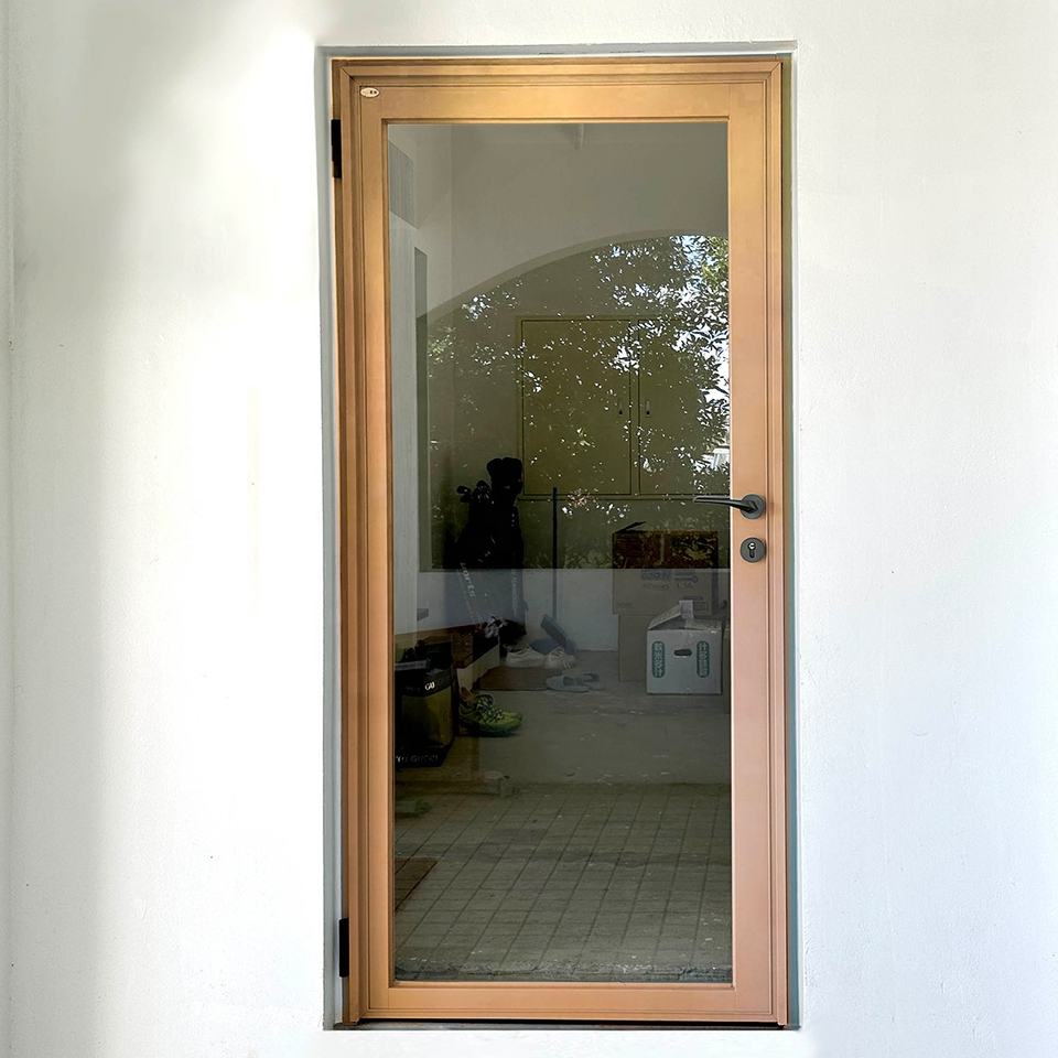 ประตูกระจกกลางแจ้งคุณภาพระดับพรีเมียมประตูกระจกกันเสียงกรอบเหล็กไทเทเนียมเพื่อการส่งออก