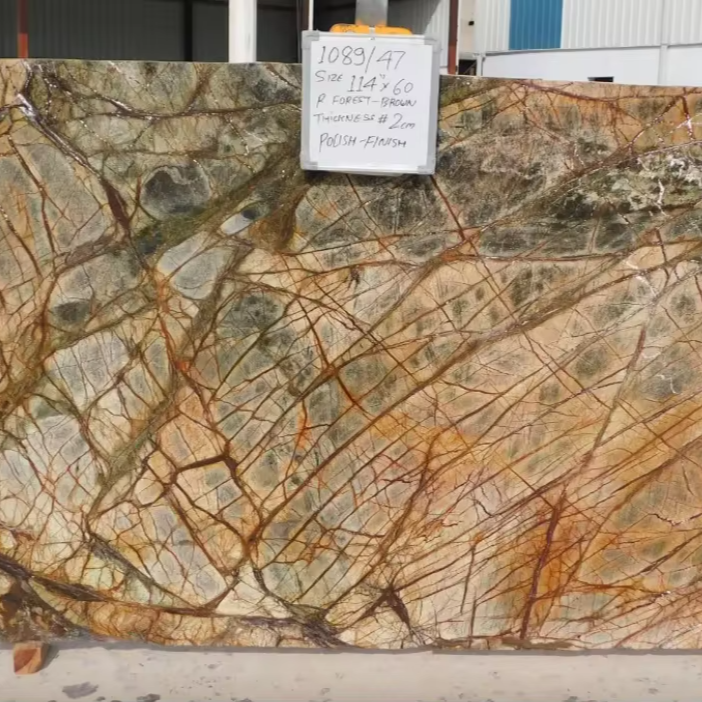 บล็อกหินอ่อนสีน้ำตาลป่าฝนคุณภาพพรีเมียม กันน้ำ หินธรรมชาติจากอินเดีย แผ่นหินแบบ Book Matched ขัดเงา สำหรับโรงแรมสมัยใหม่