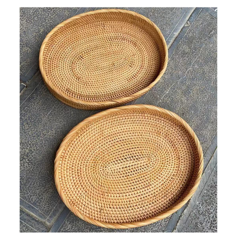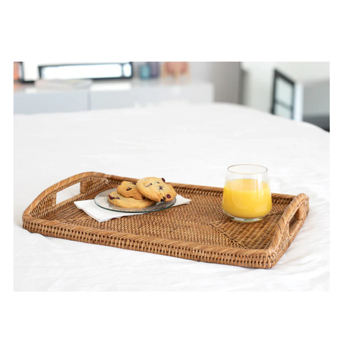 ถาดเสิร์ฟทรงสี่เหลี่ยมสไตล์โบฮีเมียนคุณภาพพรีเมียม ทำจากหวายสานด้วยมือ พร้อมหูจับไม้ เป็นมิตรกับสิ่งแวดล้อม ผลิตในอินเดีย เหมาะสำหรับใช้ในครัวและเสิร์ฟชา