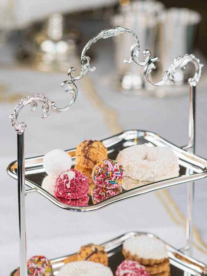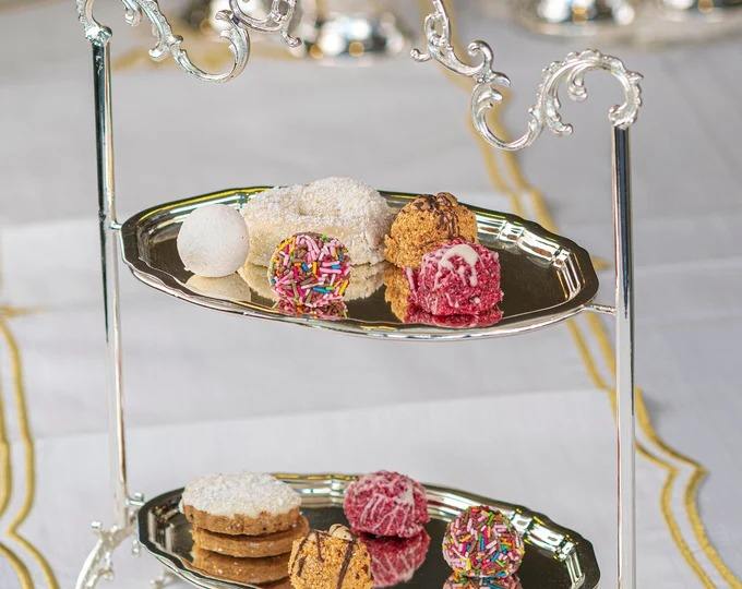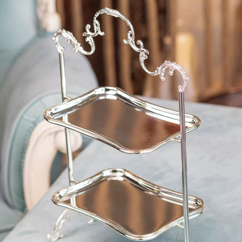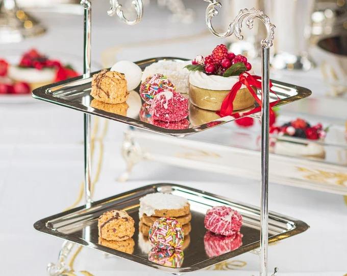 ขาตั้งเค้กทรงสี่เหลี่ยมสองชั้น คุณภาพพรีเมียม ผิวสีเงิน เหมาะสำหรับงานเลี้ยงรับรองแขกและใช้เป็นของขวัญ นำเข้าจากอินเดีย