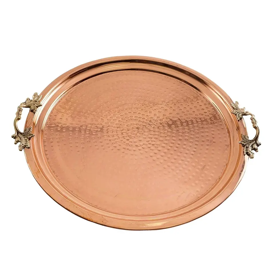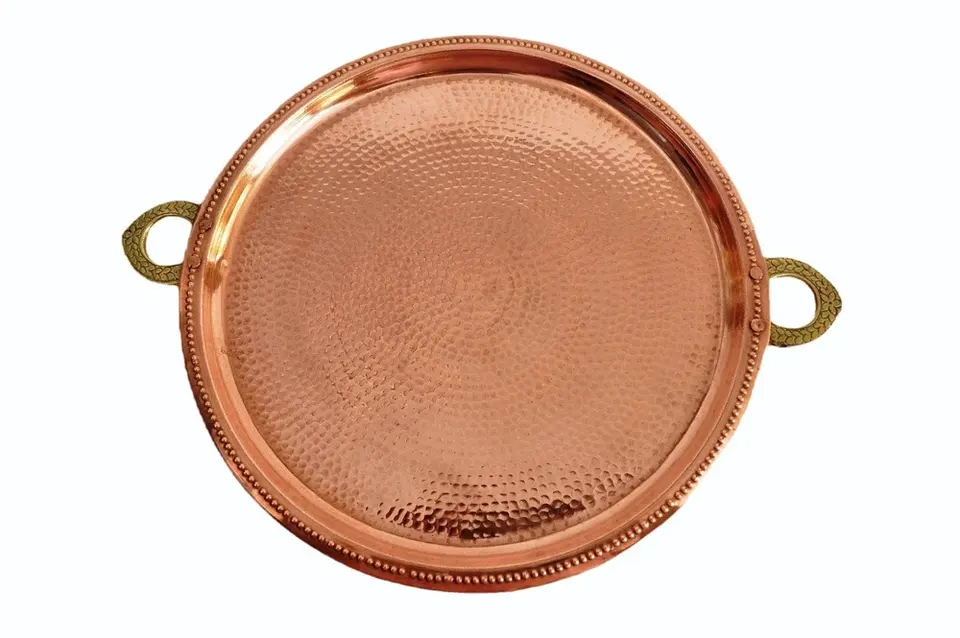 แผ่นเสียงทองแดงทรงกลมพร้อมที่จับทองเหลืองสำหรับเสิร์ฟอาหารทนทานและมีสไตล์