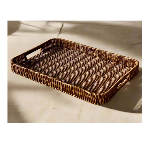 ถาดเสิร์ฟทรงสี่เหลี่ยมผืนผ้าหวายคุณภาพพรีเมียม สไตล์เรียบง่าย ทอมือด้วยมือ พร้อมหูจับไม้ เป็นมิตรกับสิ่งแวดล้อม ผลิตในอินเดีย เหมาะสำหรับใช้ในครัว ใส่ชา กาแฟ