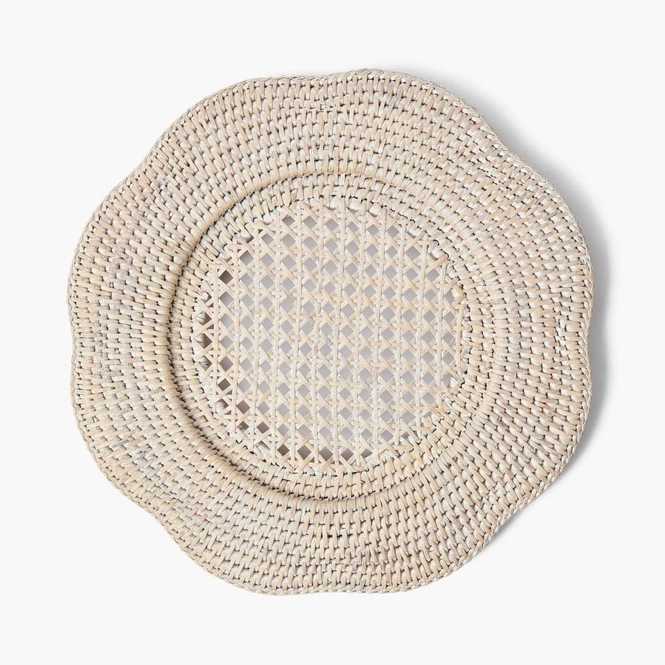 แผ่นที่ชาร์จไม้ไผ่หวายหอยเชลล์สีขาวแผ่นกลมสำหรับงานปาร์ตี้และงานแต่งงาน