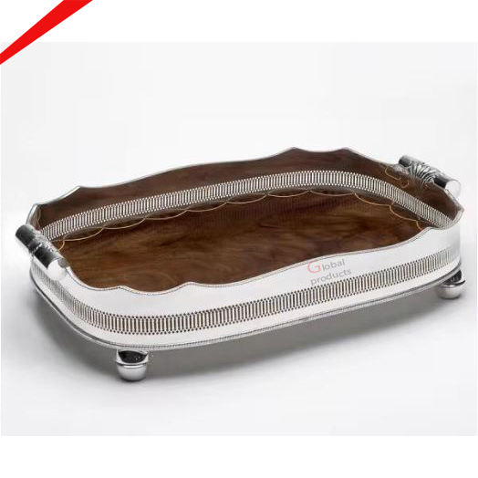 Premium Quality Silver Finished Hammered Design Golden Leaf Handle Serving Tray