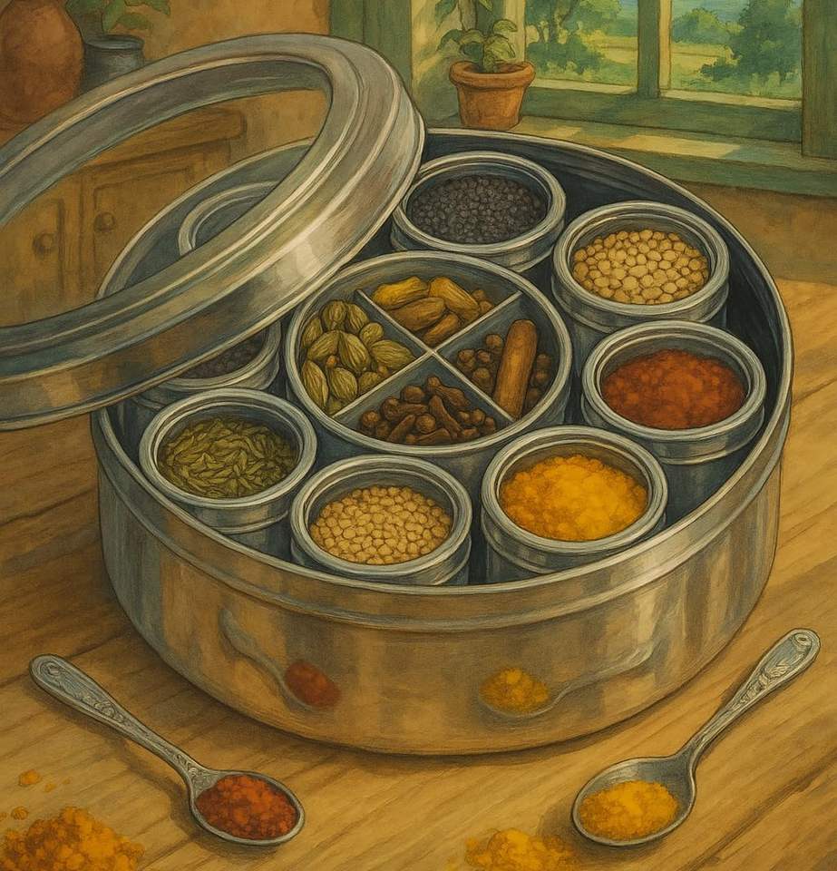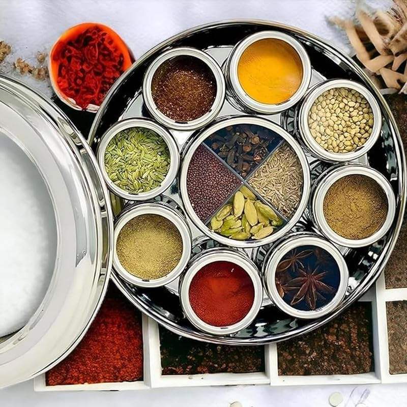 คำอธิบาย:ภาชนะใส่เครื่องเทศ Masala Dabba จากสเตนเลสสตีลของอินเดีย
