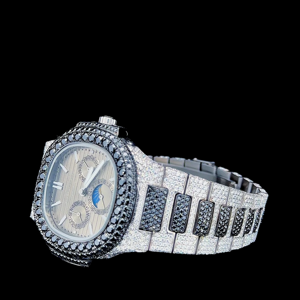 นาฬิกาแบรนด์เนมคุณภาพพรีเมียม ตัวเรือนสแตนเลสสตีลทรงเหลี่ยมประดับเพชรโมอิสซาไนต์ทรงกลมเต็มหน้าปัด พร้อมลวดลายโบราณ