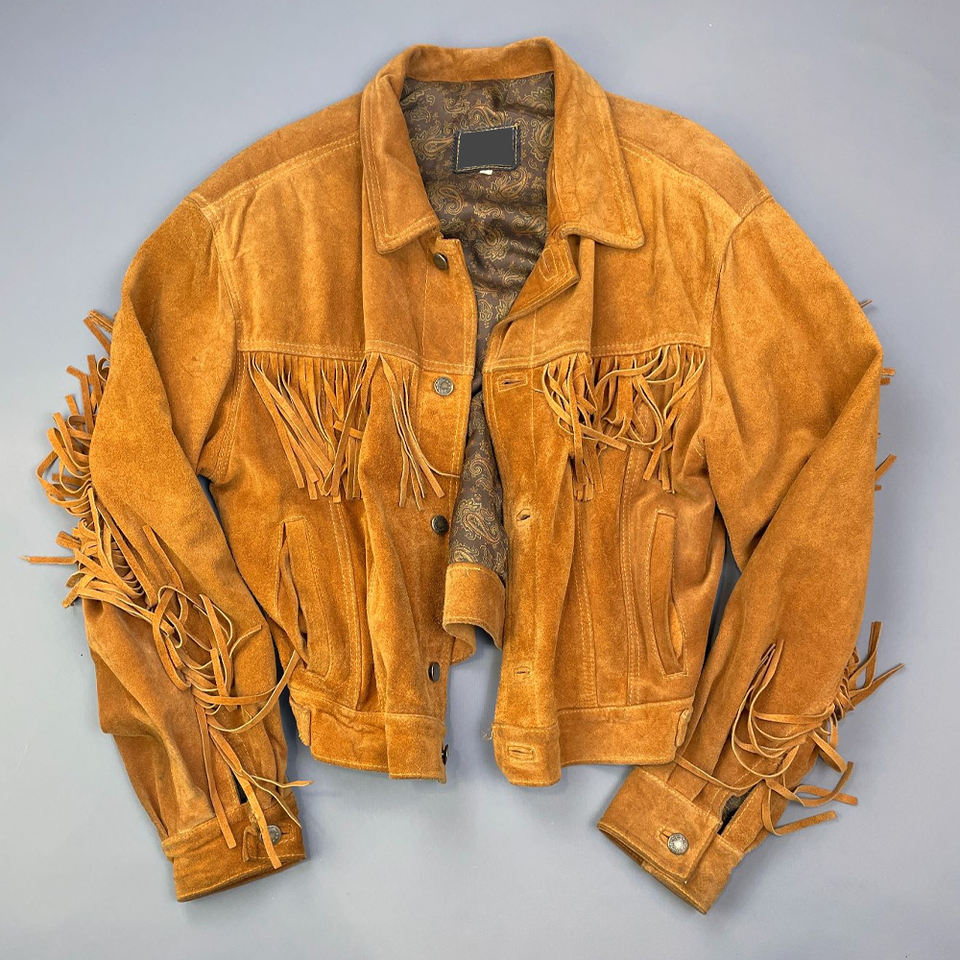 เสื้อแจ็คเก็ตหนังกลับคุณภาพพรีเมียม แต่งชายครุย ดีไซน์สั่งทำได้ แฟชั่นสตรีทแวร์ สไตล์คาวบอย