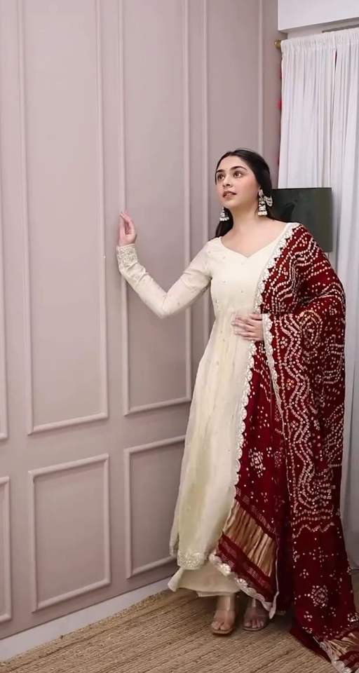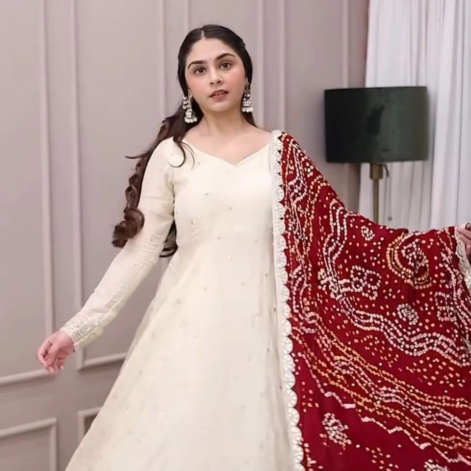 ชื่อผลิตภัณฑ์:ชุดคลุมเย็บปักถักร้อยและกางเกงผ้าไหม Chinon พร้อม dupatta