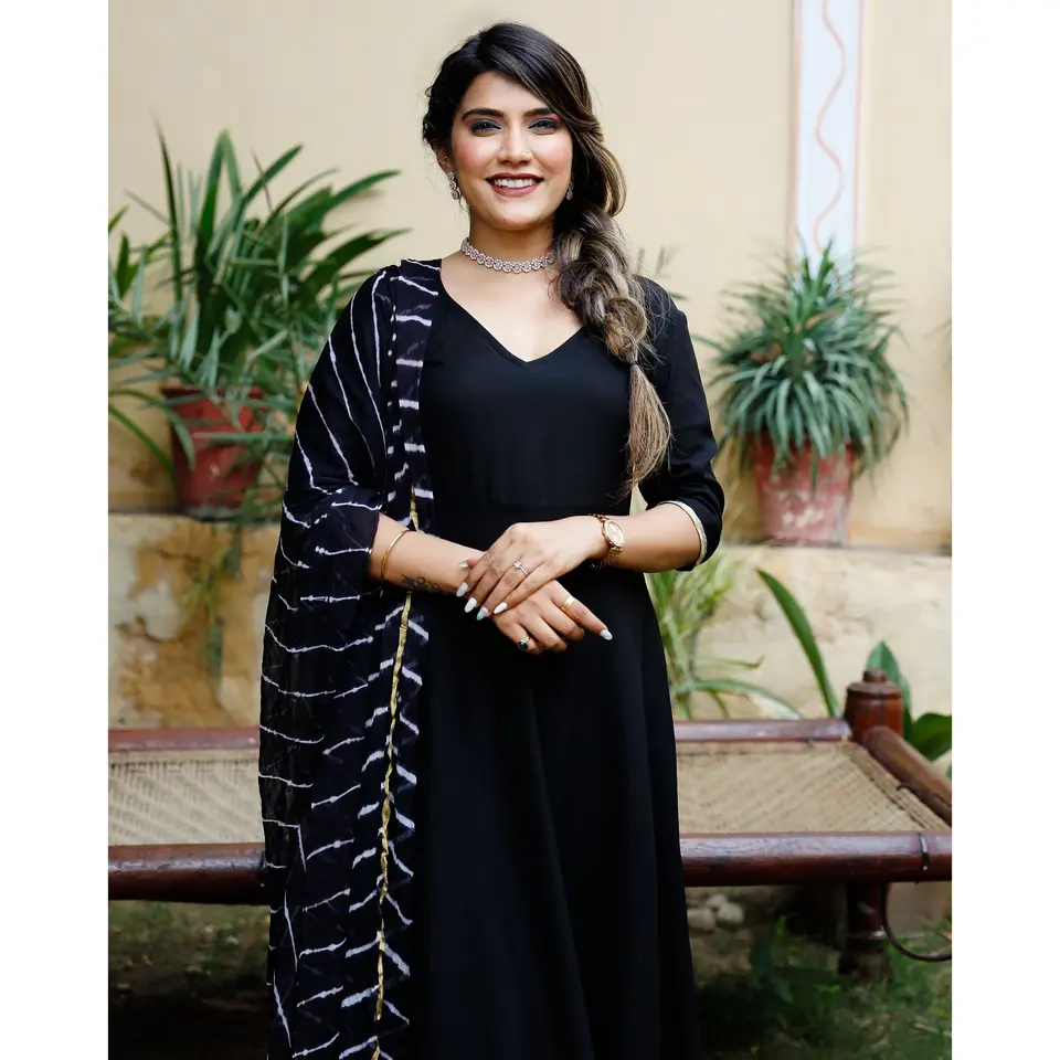 ชุดสัลวาร์ คามีซสีดำแบบดั้งเดิมคุณภาพพรีเมียม พร้อมเสื้อและกางเกง ผ้าคลุมไหล่ลายเลเฮริยา สำหรับงานปาร์ตี้ ดีไซน์ยอดนิยม ลดราคาพิเศษทางออนไลน์