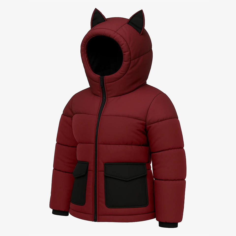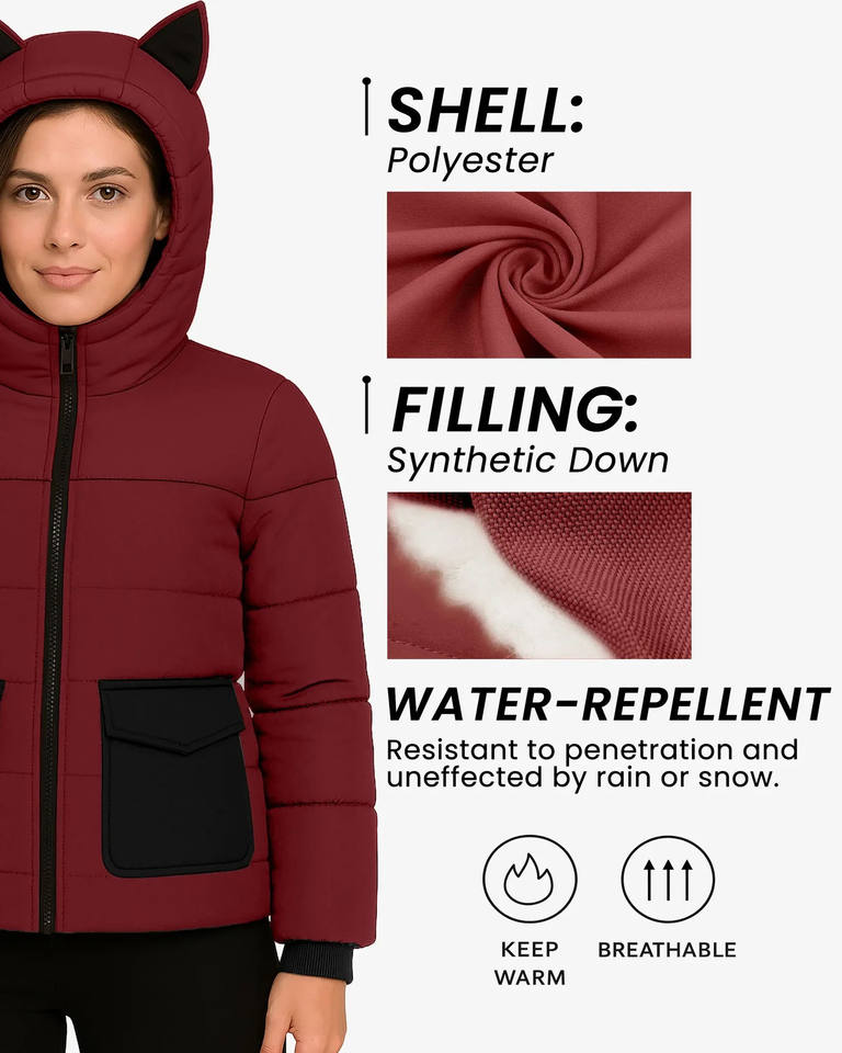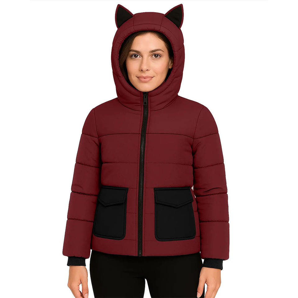 Premium Quality Trendy Product Attractive Look Women Red Quilted Coat with Fun Animal-Inspired Hood Warm Quilted Winter Jacket