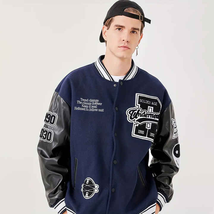แจ็คเก็ตวาร์ซิตี้ทรงสลิมสำหรับผู้ชาย คุณภาพพรีเมียม คอตั้ง ปักโลโก้ด้านหน้า ผ้าฝ้าย 100% สไตล์ไฮสตรีทสำหรับฤดูหนาว บริการ OEM
