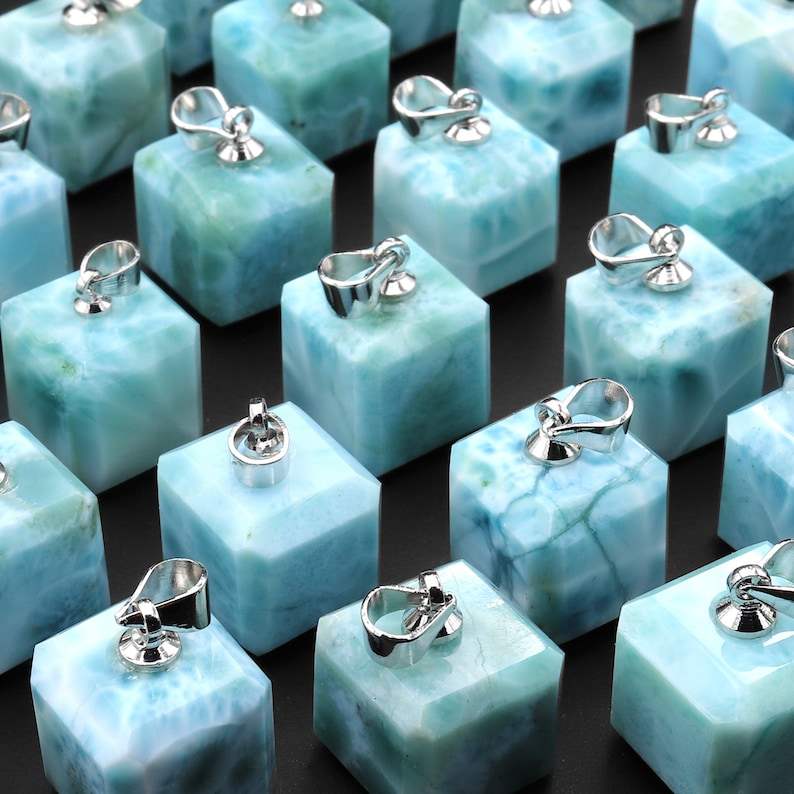 จี้ลูกเต๋าลาริมาร์สีน้ำเงินธรรมชาติทรงเหลี่ยมคุณภาพพรีเมียม ขนาด 8 มม.-16 มม. ตัวเรือนเงินแท้ชุบทอง