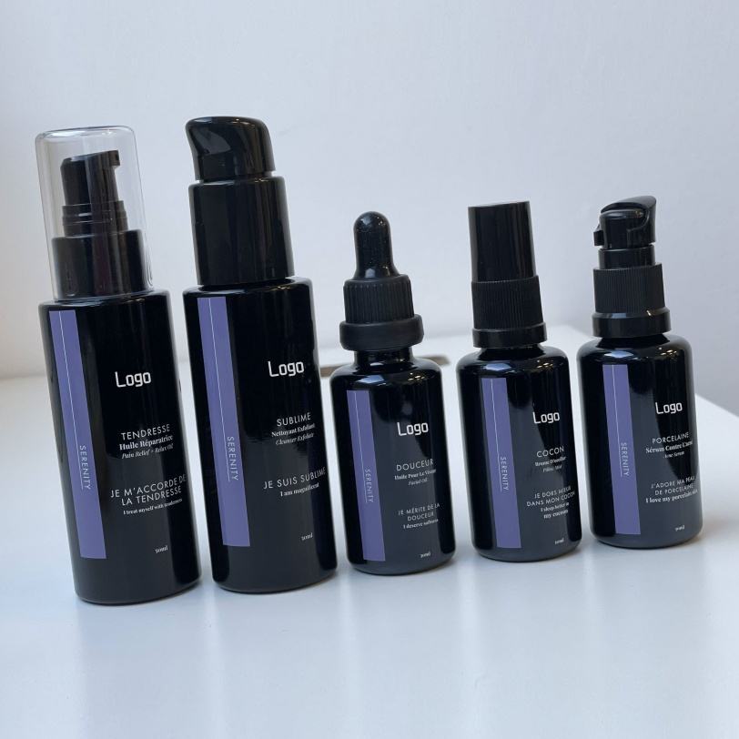 ขวดแก้วสีม่วงคุณภาพพรีเมียม ขนาด 30 มล. 50 มล. 100 มล. 200 มล. ทรงไหล่แบน สีดำม่วง สำหรับบรรจุเซรั่มหรือน้ำมัน พร้อมหัวปั๊มหยด