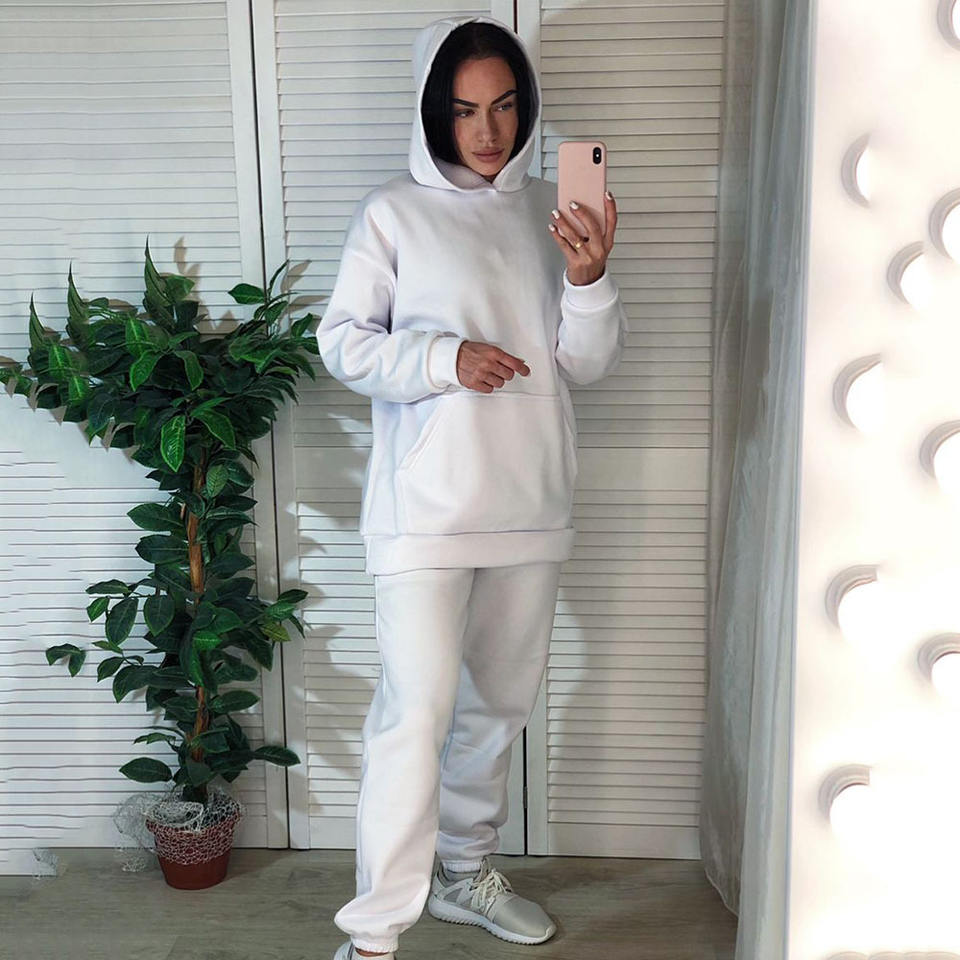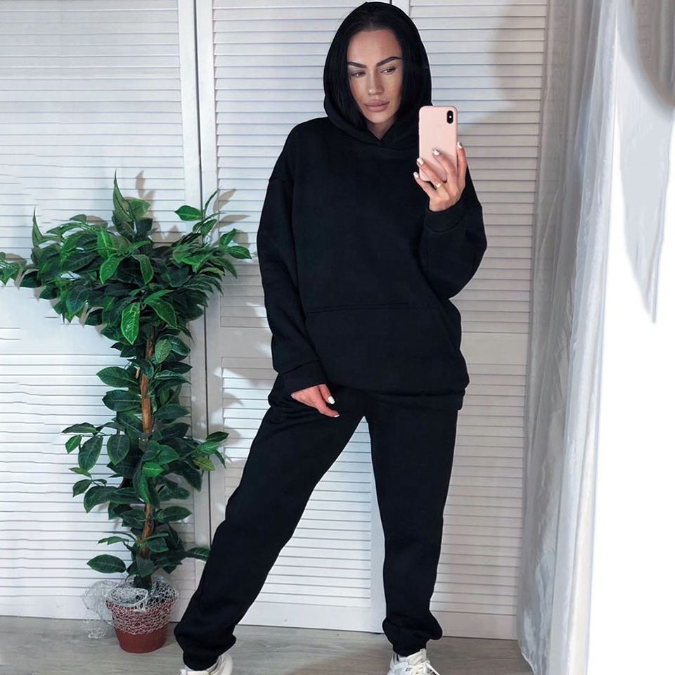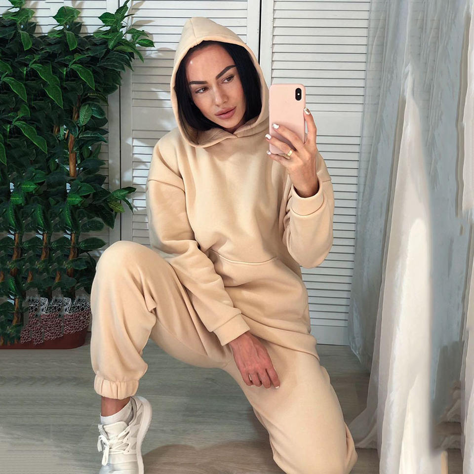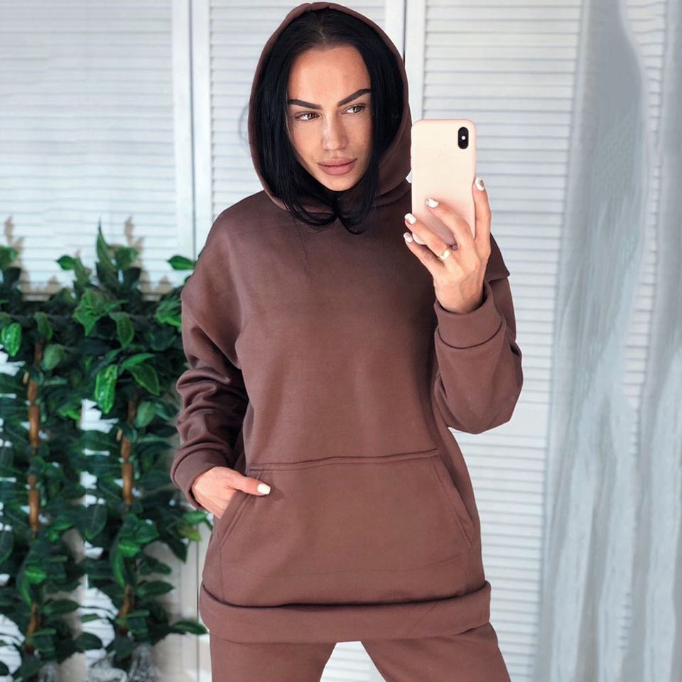 ชุดจ๊อกกิ้งแบบมีกระเป๋า2ใบสำหรับผู้หญิง,ชุดวอร์มแขนยาวสีล้วนมีฮู้ดสำหรับฤดูหนาวใบไม้ร่วง